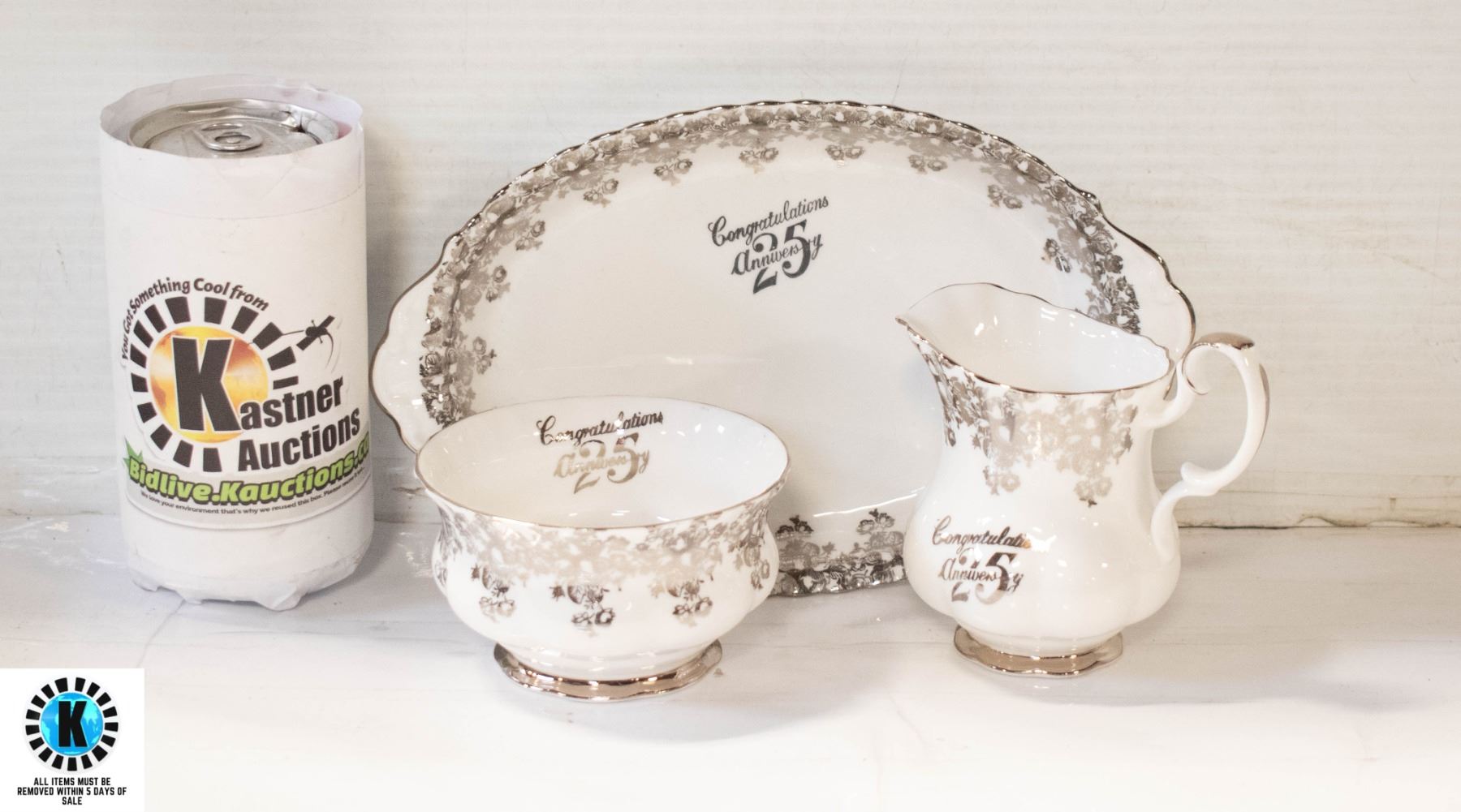ROYAL ALBERT 25TH ANNIVERSARY CREAM/SUGAR/TRAY SET