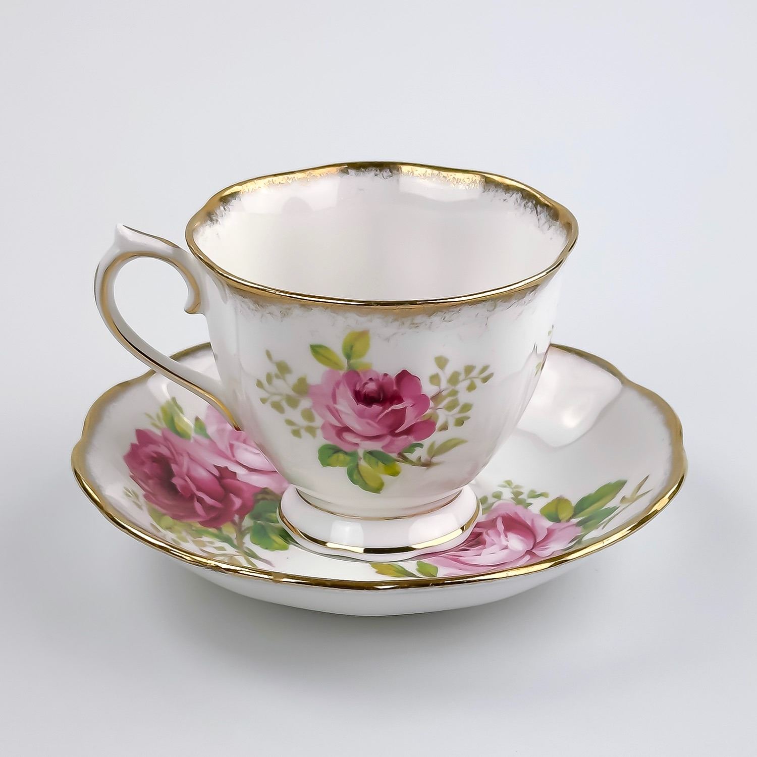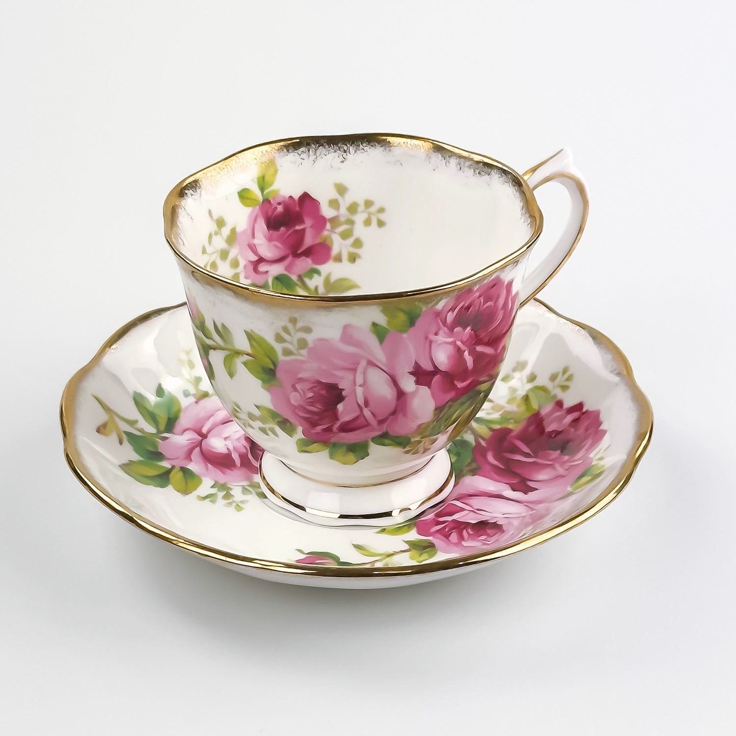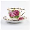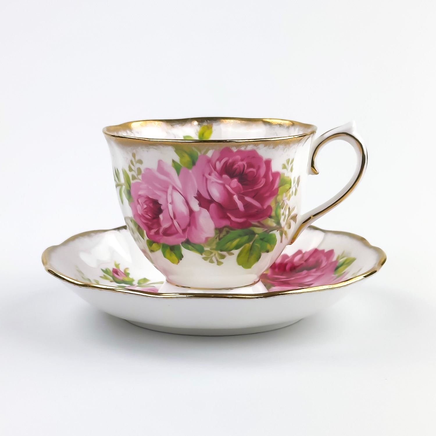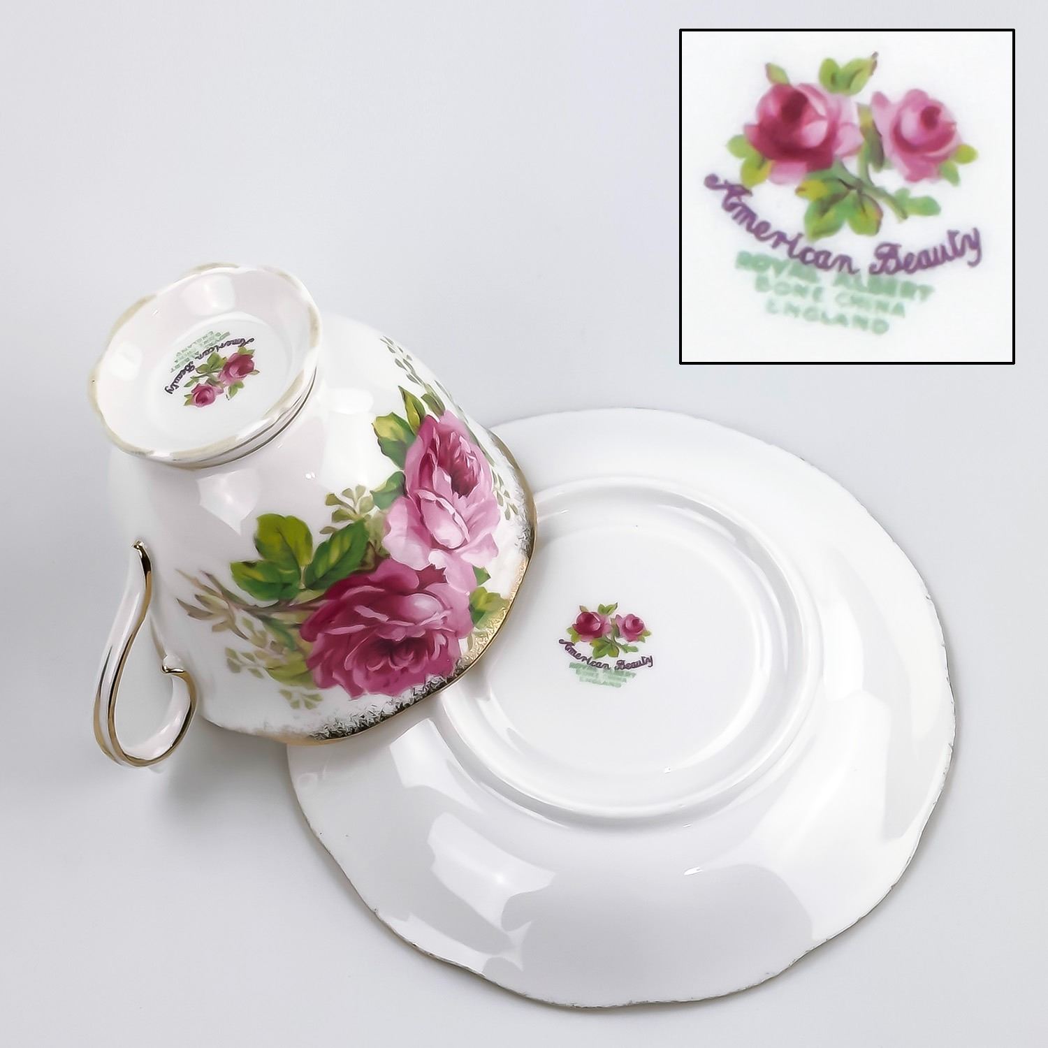 #8169 - VINTAGE ROYAL ALBERT AMERICAN BEAUTY ENGLAND TEACUP & SAUCER SET. PINK & RED CABBAGE ROSE PATTERN WITH GOLD TRIM. PRE-OWNED USED CONDITION - SHOWS SOME VERY MINOR SURFACE WEAR DUE TO AGE AND/OR USE. OVERALL IT IS IN GREAT CONDITION - GOLD TRIM LOOKS GREAT WITH LITTLE TO NO SIGNS OF WEAR. NO CRACKS, CHIPS OR REPAIRS - THEY BOTH PING NICELY. BONE CHINA KITCHENWARE