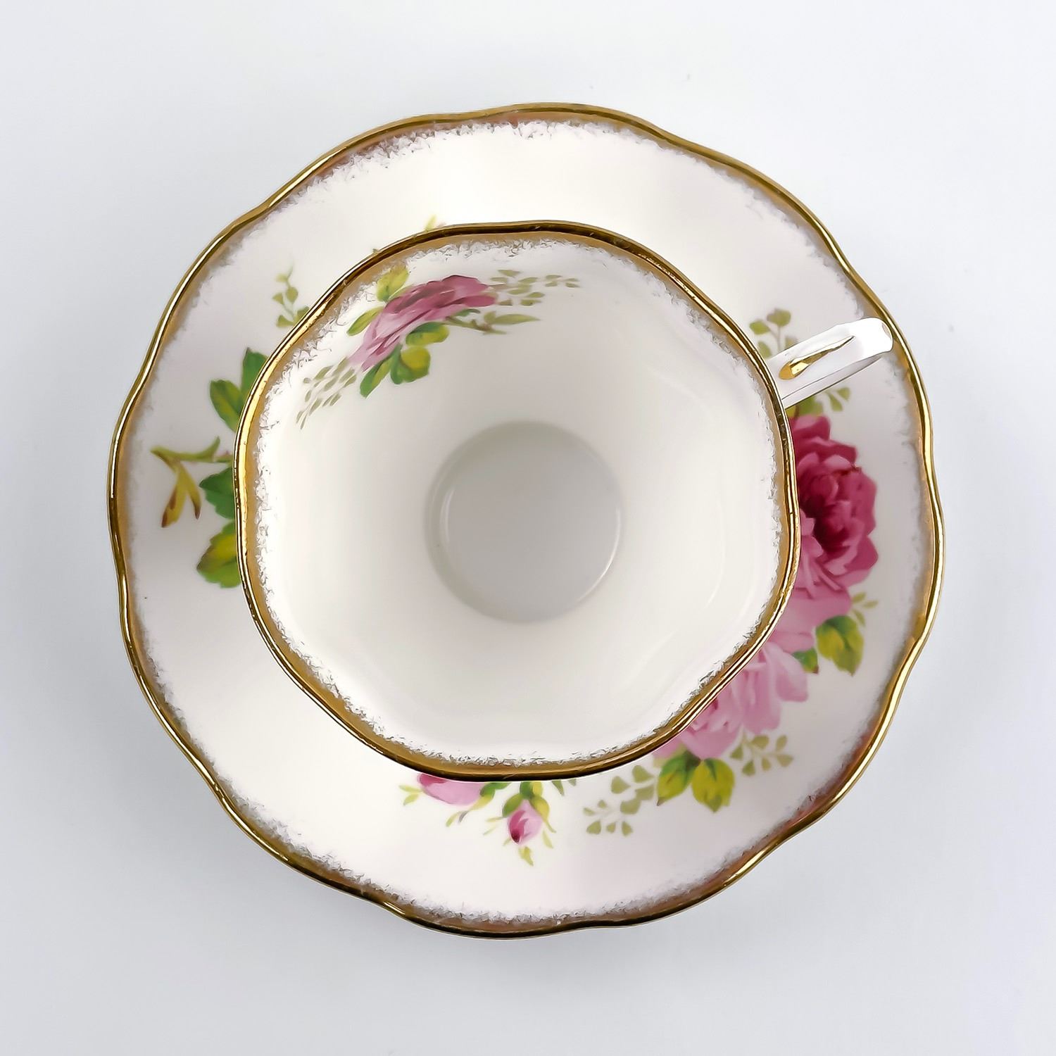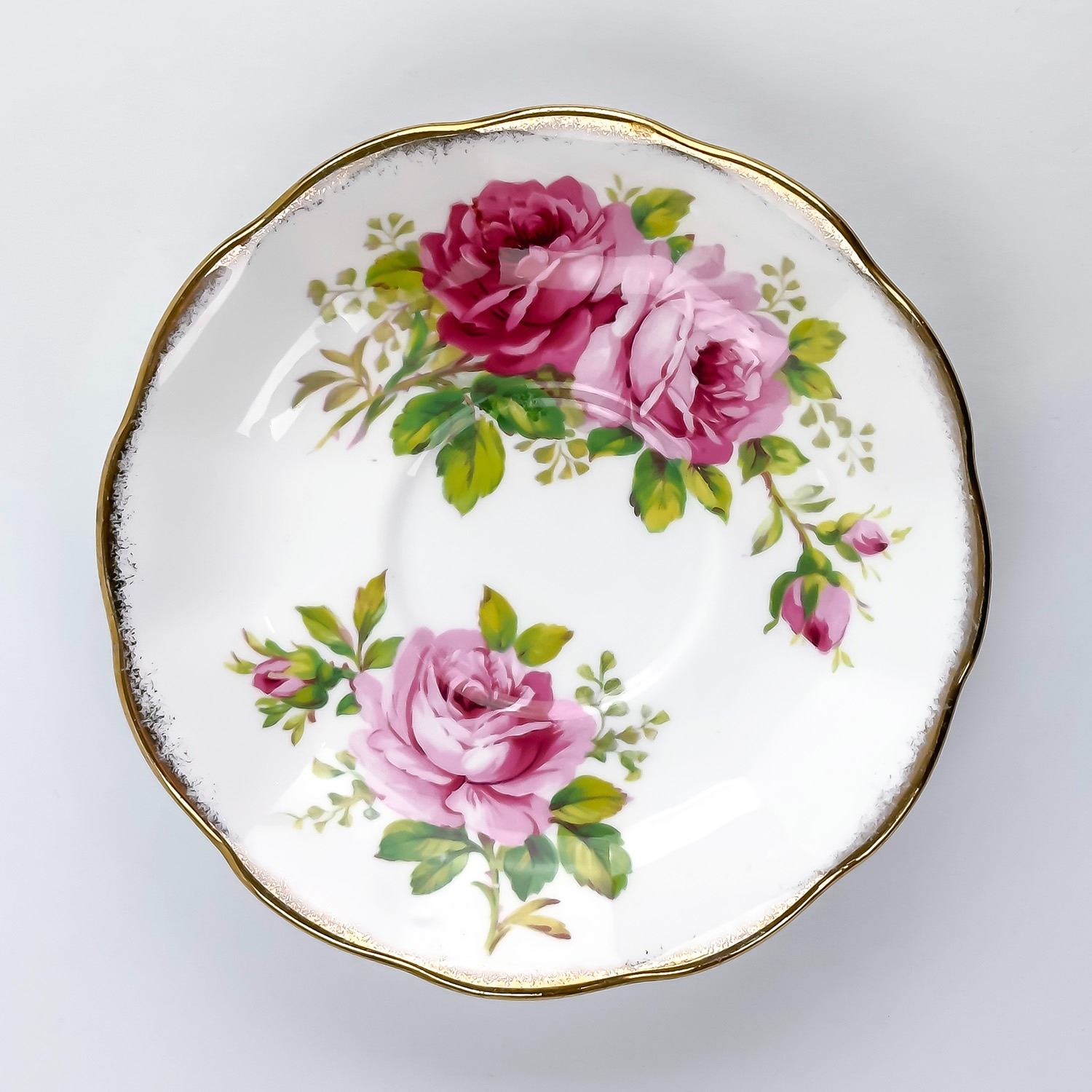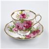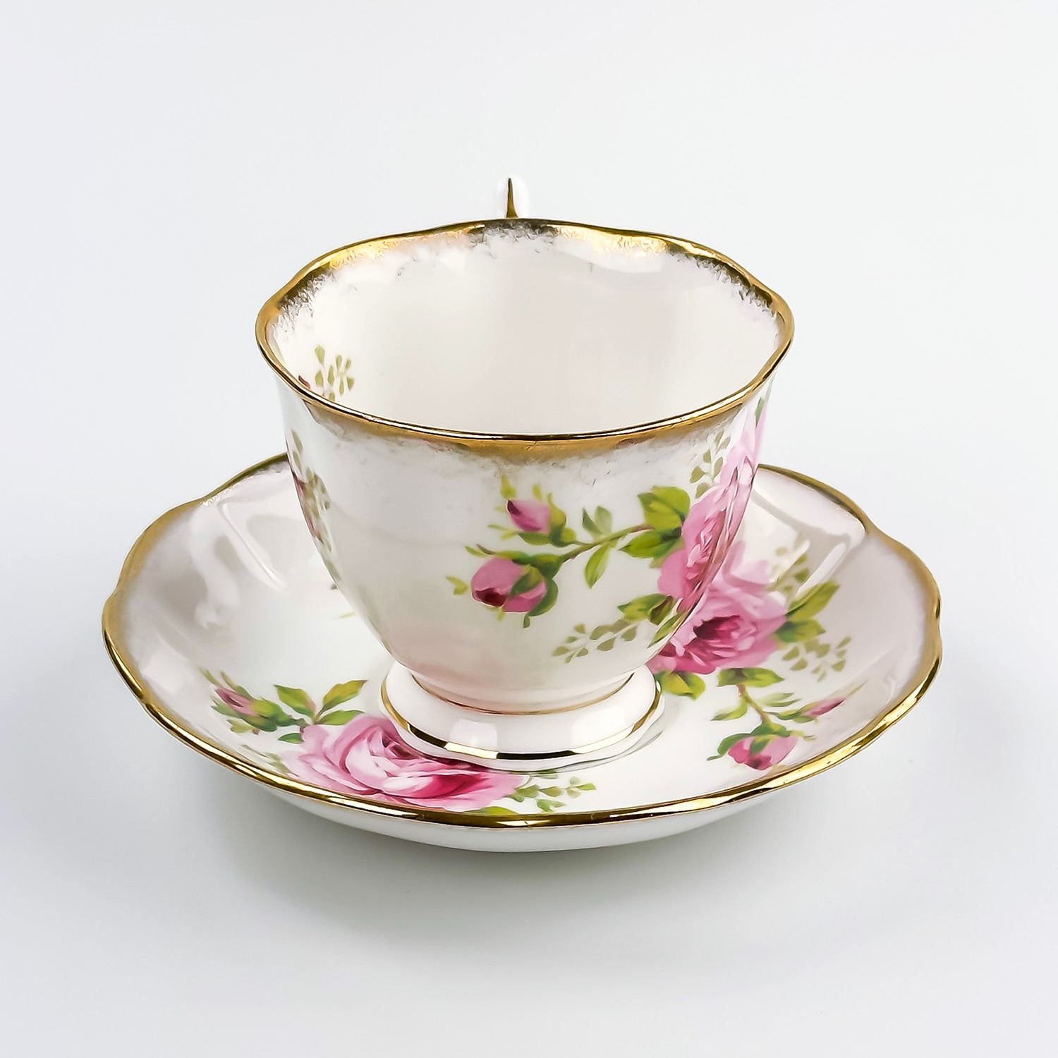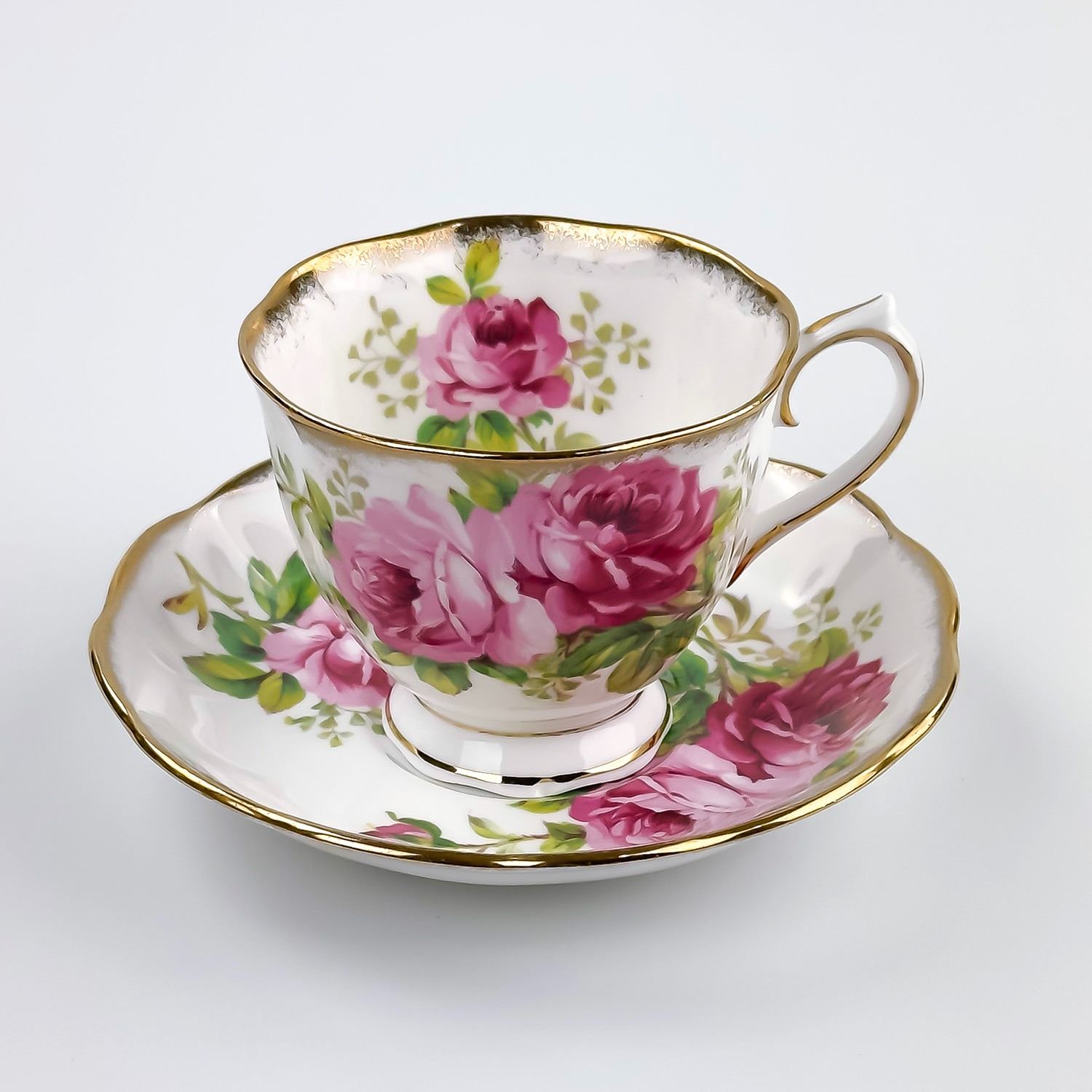 #8169 - VINTAGE ROYAL ALBERT AMERICAN BEAUTY ENGLAND TEACUP & SAUCER SET. PINK & RED CABBAGE ROSE PATTERN WITH GOLD TRIM. PRE-OWNED USED CONDITION - SHOWS SOME VERY MINOR SURFACE WEAR DUE TO AGE AND/OR USE. OVERALL IT IS IN GREAT CONDITION - GOLD TRIM LOOKS GREAT WITH LITTLE TO NO SIGNS OF WEAR. NO CRACKS, CHIPS OR REPAIRS - THEY BOTH PING NICELY. BONE CHINA KITCHENWARE