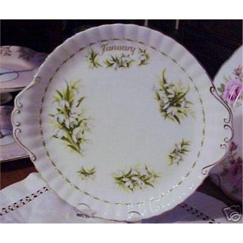 BEAUTIFUL CAKE PLATE, COMES FROM ROYAL ALBERT COLLECTION - FLOWER OF THE MONTH - JANUARY - SNOWDROPS - as per image - EXCELLENT CONDITION,NO CHIPS OR CRACKS WITH GOLD TRIM INTACT, MEASURES 10 1/4" X 9", US BUYER TO PAY 8.00 FOR SHIPPING PLUS INSURANCE.THANKS FOR LOOKING.