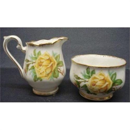 BEAUTIFUL CREAM AND SUGAR SET,MADE BY ROYAL ALBRT BONE CHINA,ENGLAND, ENTITLED "TEA ROSE", GORGEOUS YELLOW ROSES! - EXCELLENT CONDITION,CREAMER STANDS ABOUT 3 1/4" HIGH, SUGAR BOWL 2" HIGH AND 3 1/4" in diam, US BUYER TO PAY 7.00 FOR SHIPPING PLUS INSURANCE.THANKS.