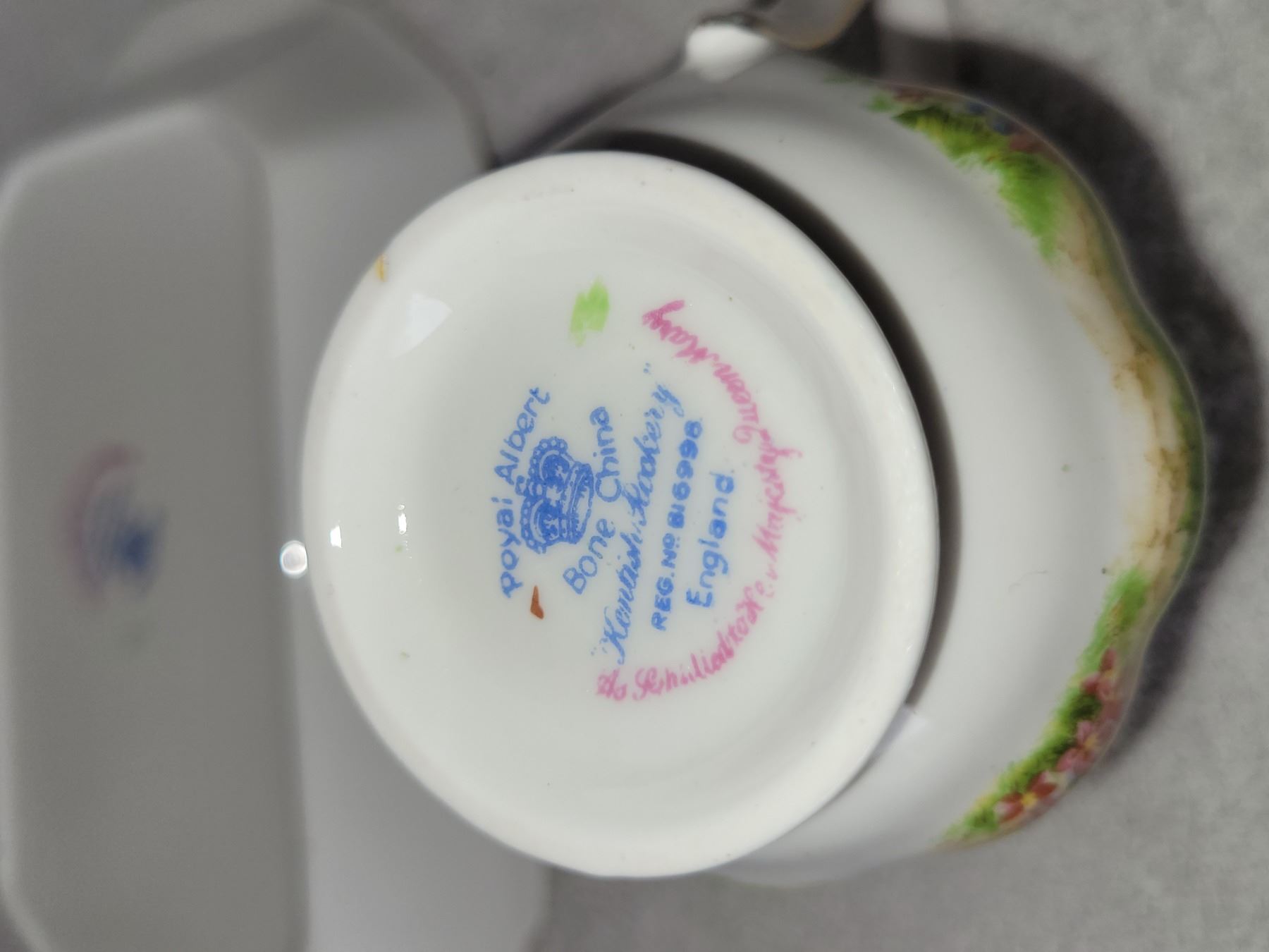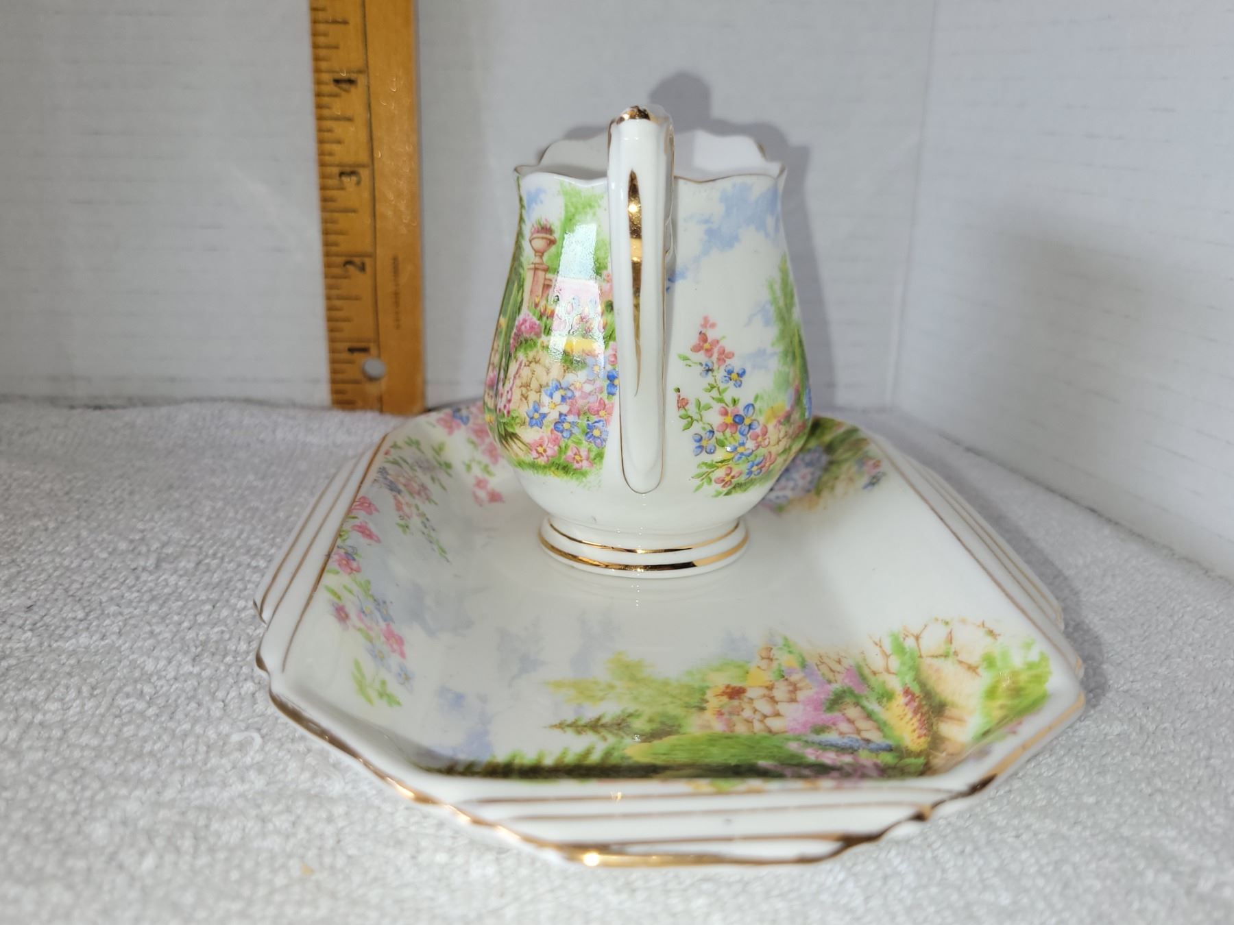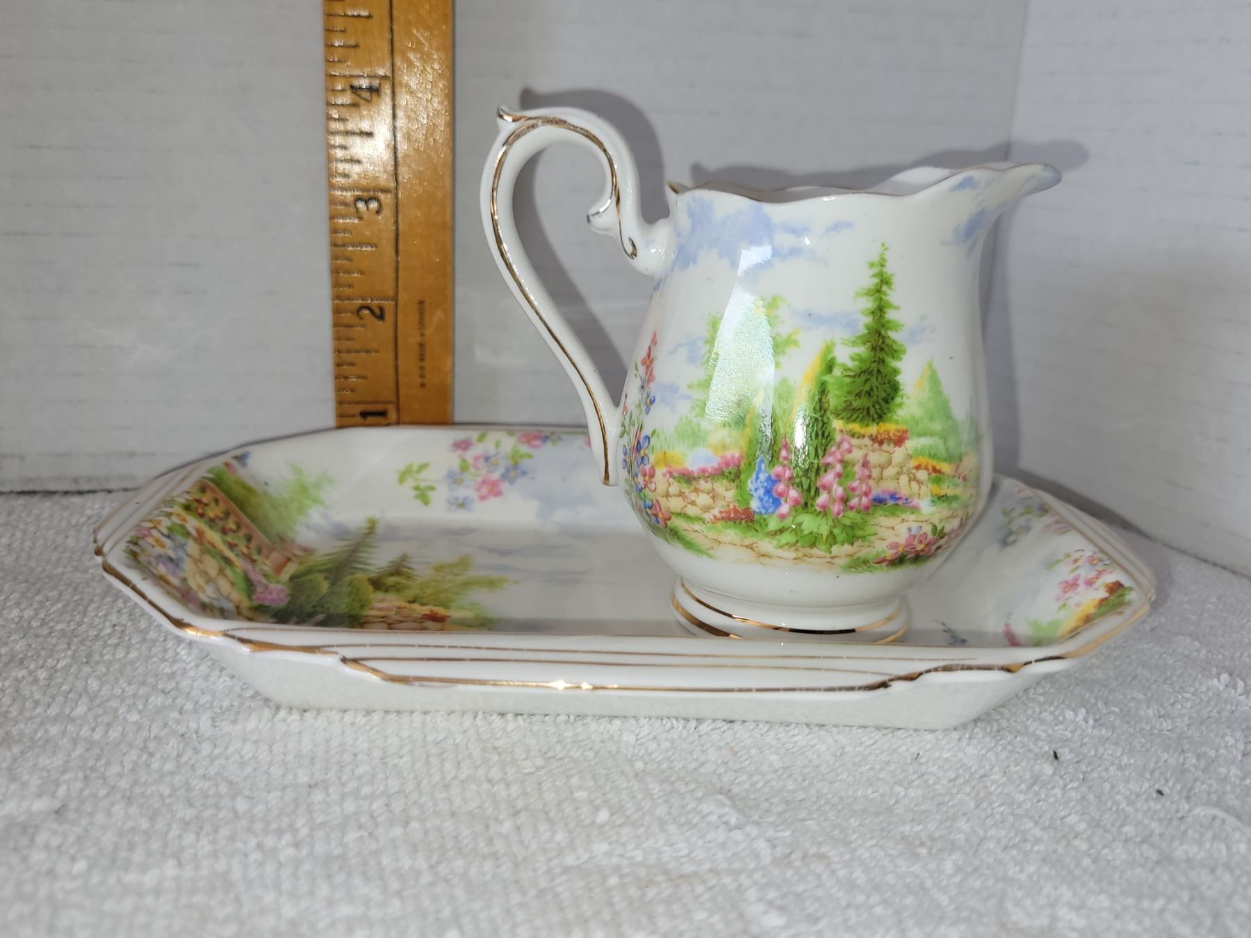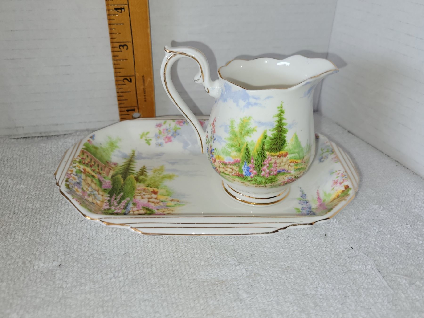 ROYAL ALBERT KENTISH ROCKERY CREAMER AND UNDERPLATE. CREAMER MEASURES 4" X 3.5", UNDERPLATE MEASURES 7.5" X 5" X 1"