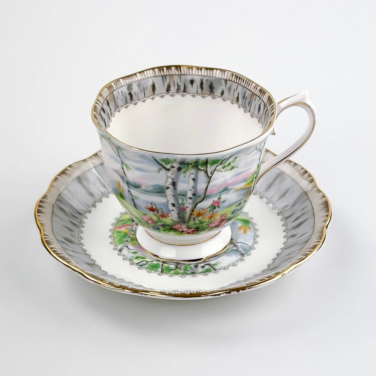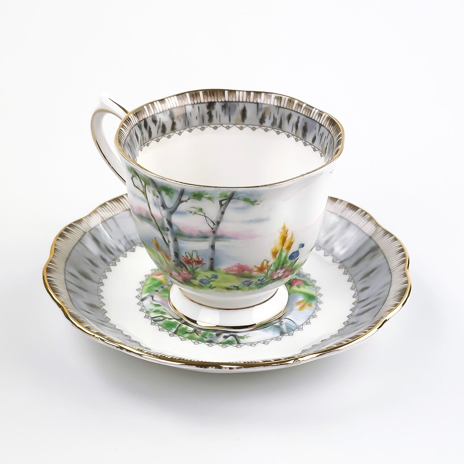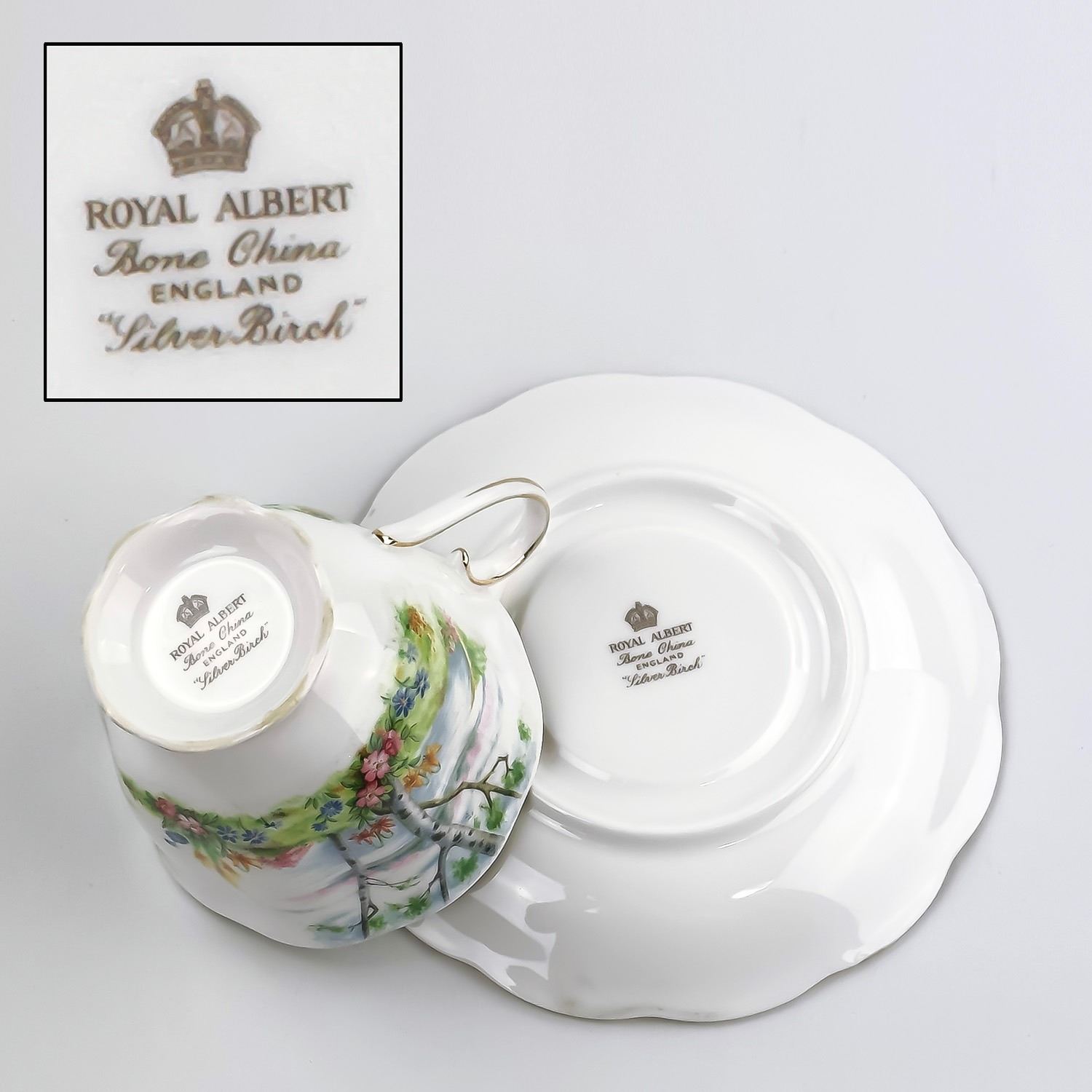 #8172 - VINTAGE ROYAL ALBERT TEACUP AND SAUCER SET - ROYAL ALBERT BONE CHINA - SILVER BIRCH PATTERN - MADE IN ENGLAND BACKSTAMP. FLORAL GARDEN-LIKE SETTING BY THE LAKE & BIRCH TREES PATTERN WITH GOLD TRIM. PRE-OWNED USED CONDITION - SHOWS SOME VERY MINOR SURFACE WEAR DUE TO AGE AND/OR USE. OVERALL IT IS IN GREAT CONDITION - GOLD TRIM LOOKS GREAT WITH LITTLE TO NO SIGNS OF WEAR. NO CRACKS, CHIPS OR REPAIRS - THEY BOTH PING NICELY. BONE CHINA KITCHENWARE