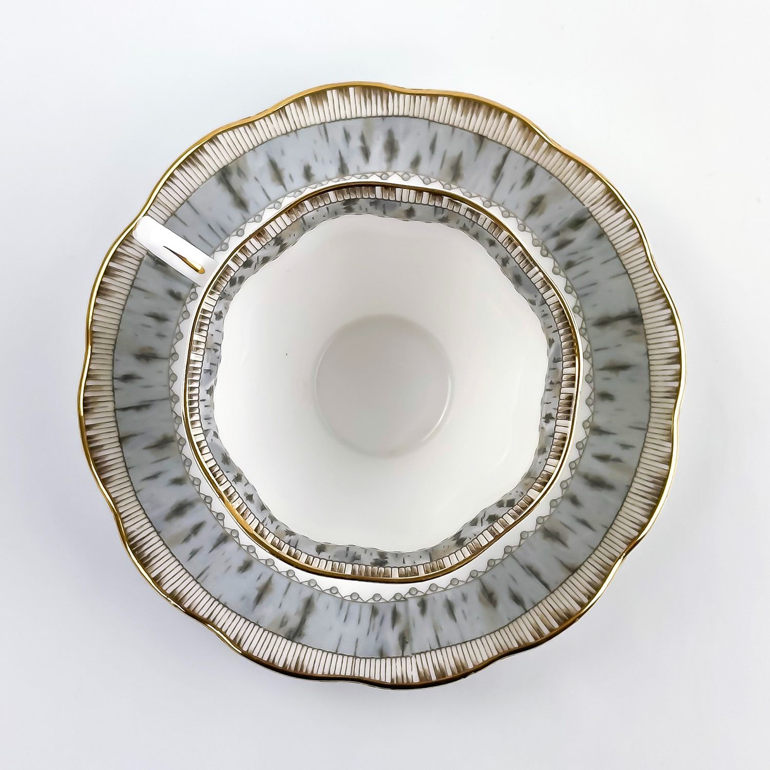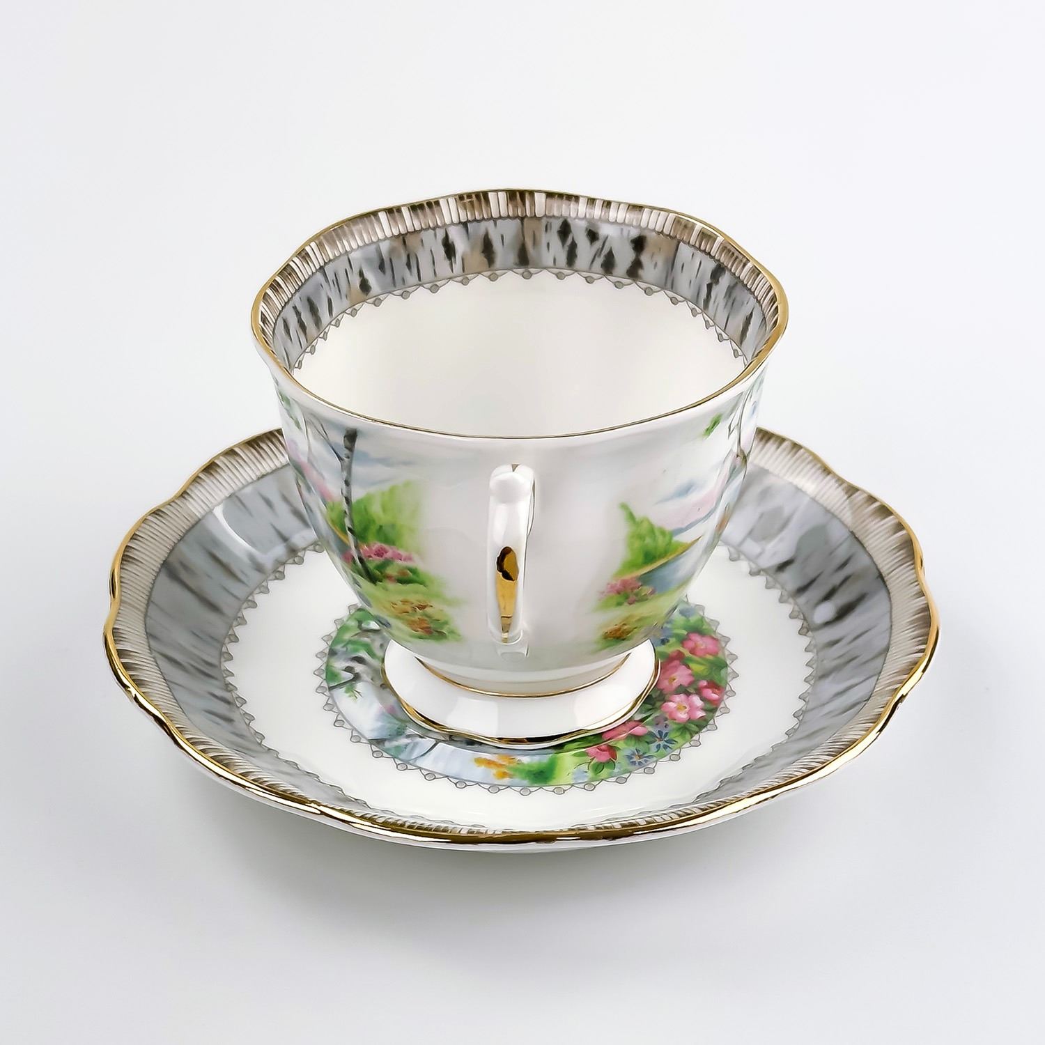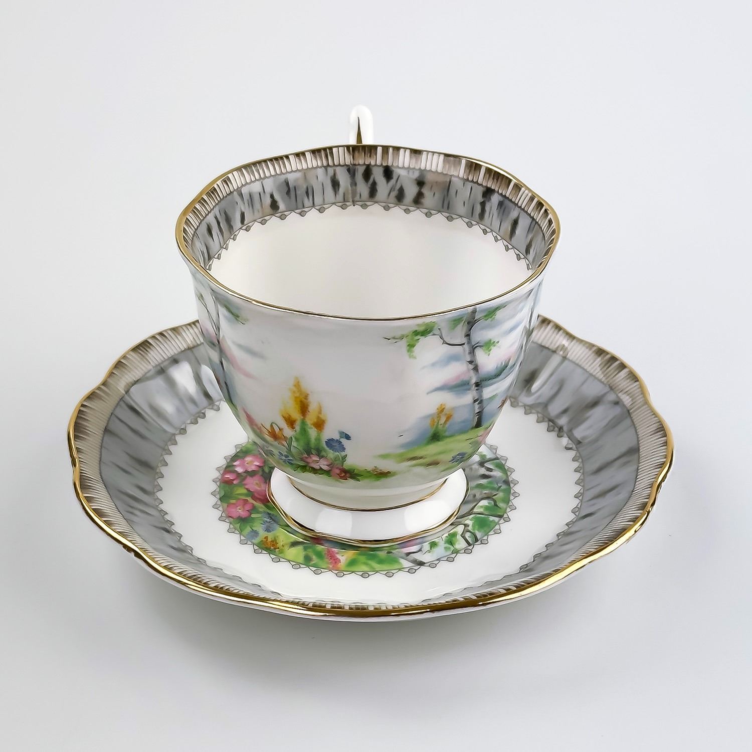#8172 - VINTAGE ROYAL ALBERT TEACUP AND SAUCER SET - ROYAL ALBERT BONE CHINA - SILVER BIRCH PATTERN - MADE IN ENGLAND BACKSTAMP. FLORAL GARDEN-LIKE SETTING BY THE LAKE & BIRCH TREES PATTERN WITH GOLD TRIM. PRE-OWNED USED CONDITION - SHOWS SOME VERY MINOR SURFACE WEAR DUE TO AGE AND/OR USE. OVERALL IT IS IN GREAT CONDITION - GOLD TRIM LOOKS GREAT WITH LITTLE TO NO SIGNS OF WEAR. NO CRACKS, CHIPS OR REPAIRS - THEY BOTH PING NICELY. BONE CHINA KITCHENWARE
