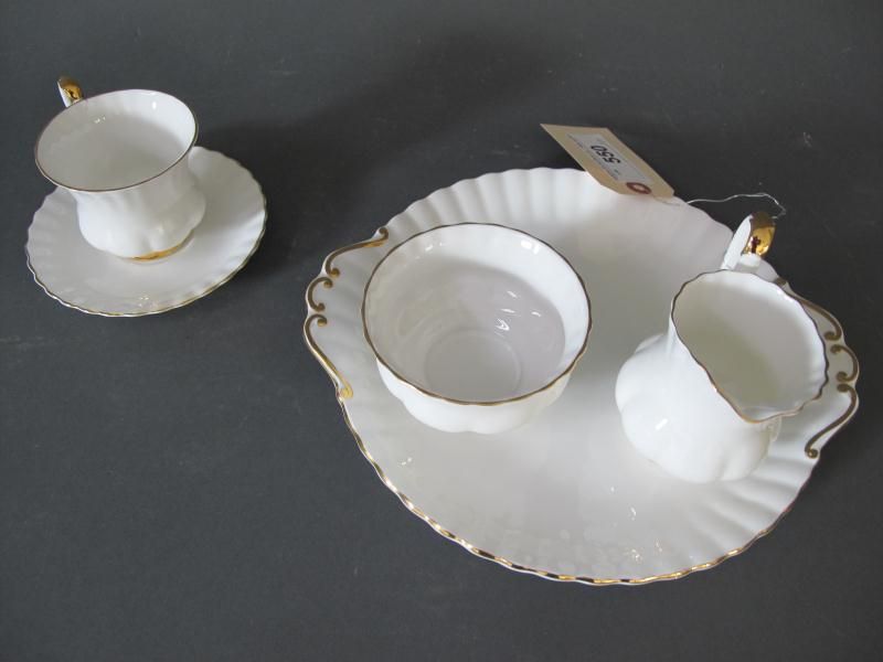 -lot consists of 9 1/4 in. cake plate, 7 cups and saucers, and a cream and sugar.