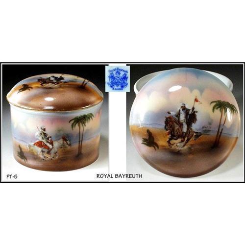 Beautiful Royal Bayreuth porcelain covered box. The lid and perimeter of the box is decorated by images of "Lawrence of Arabia" on horse. MINT condition, no chips, cracks or repairs. Blue mark "Royal Bayreuth". Dimension : 3-1/4"H x 3 5/8" diameter.