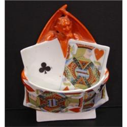 ROYAL BAYREUTH WALL POCKET. Figural devil and playing card decoration. Marked on reverse. One small chip at bottom. 5” H