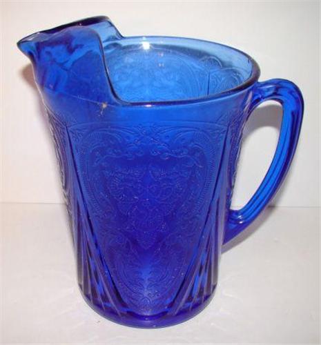 ROYAL BLUE LACE DEPRESSION GLASS PITCHER. Shows some straw marks near bottom of body. 7.5" H