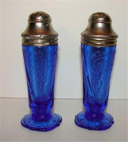 ROYAL BLUE LACE DEPRESSION GLASS SALT & PEPPER SHAKERS. Silverplate tops. Top on one shaker shows some denting. 4.25" H
