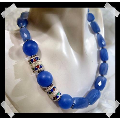 The perfect accessory this ROYAL Blue Chalcedony is a showstopper and definitely in a class of it's own. Not only is it the most vivid of color.. and the perfect accessory for dressing up or down....Vera has chosen to accent the faceted stones with three 17mm round stones PLUS the most delightful of fine enamel sterling silver beads. These two beads clearly illustrate why Thailand is the leader in the world of enamel. These accent beads measure 16x12mm. (25mm=1")