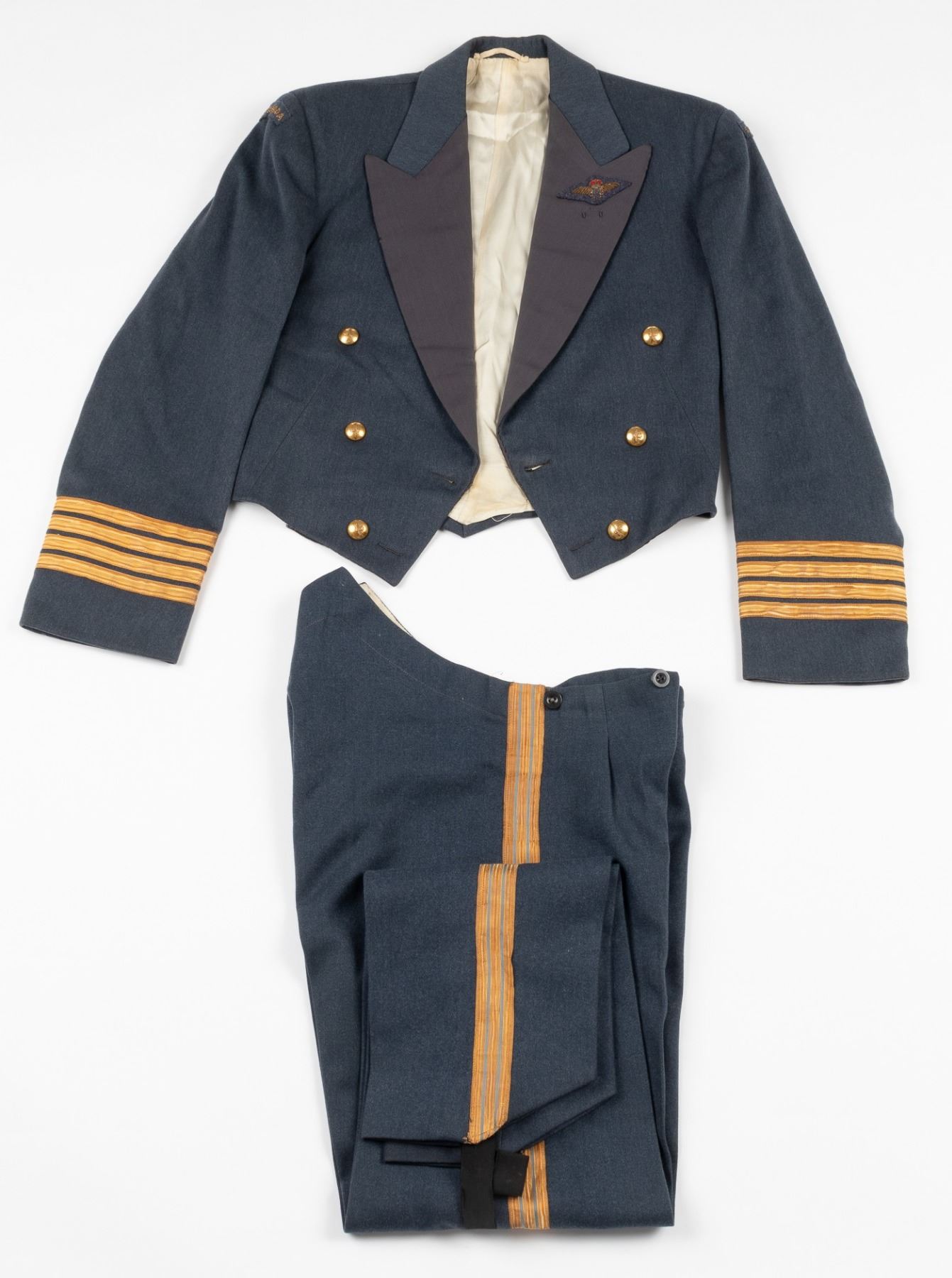 Uniform of the Royal Canadian Air Force including one dress coat and one pair of dress pants. The dress coat is named on the inside pocket for 'W.J.Marsh', or William James Marsh, a Flight Lieutenant and Wing Commander in the Royal Canadian Air Force. The dress coat has an RCAF wings patch sewn onto the lapel and two small 'Canada' patches on the left and right sleeves. Marsh was awarded Queen's Commendations for Brave Conduct following an incident in August 1957 where Marsh saved a fellow military servicemember. Marsh was driving on a Royal Canadian Air Force base to pick up another pilot who had recently landed when he witnessed an accident. Marsh observed an aircraft disappear in a large mushroom of smoke, far off the end of the runway. He drove his car to the accident site and found the burning aircraft on its side. He heard the pilot, Squad Leader Frizzle call for help. With complete disregard for his own safety, Marsh struggled through the bush to the cockpit area. Unaided in trying to extricate the pilot, Marsh called over to four other men for help rescuing the man. With great difficulty and considerable risk, Marsh and the other men removed the pilot from the aircraft and moved him to safety so his injuries were not aggravated. For this action and the courage he displayed on that day, Marsh was awarded the George Medal, a very rare award for a member of the RCAF. Only 28 George Medals have been awarded to RCAF members, 20 of which were during the war.