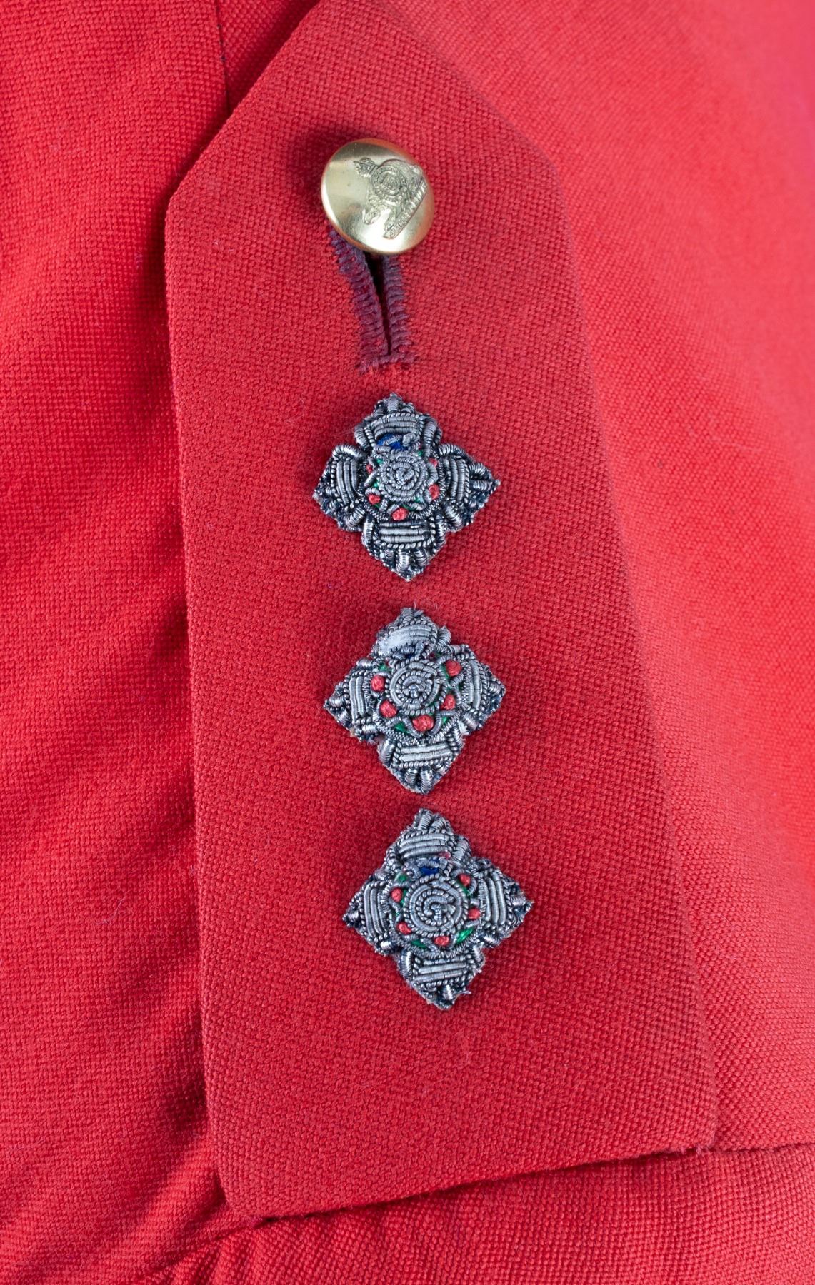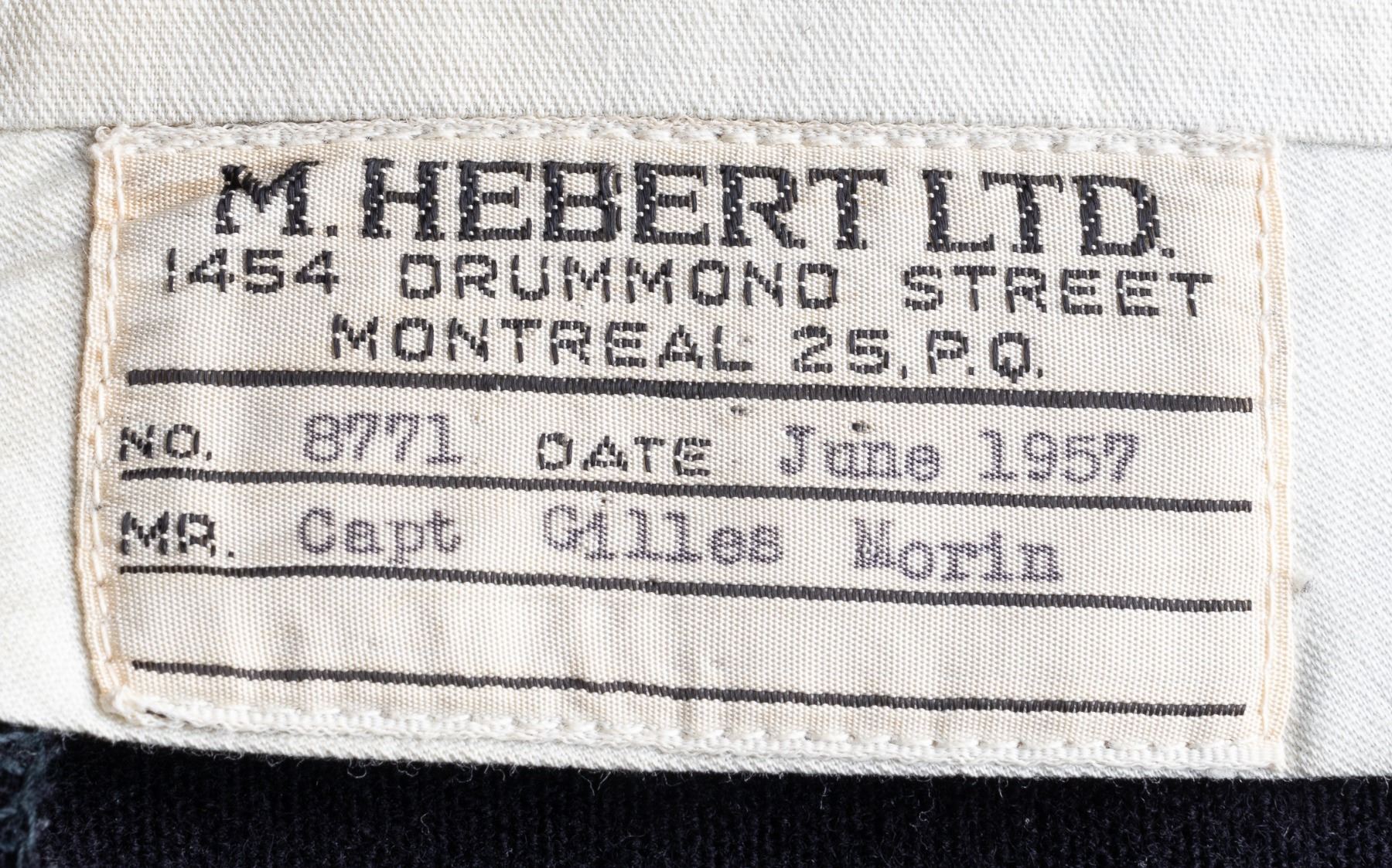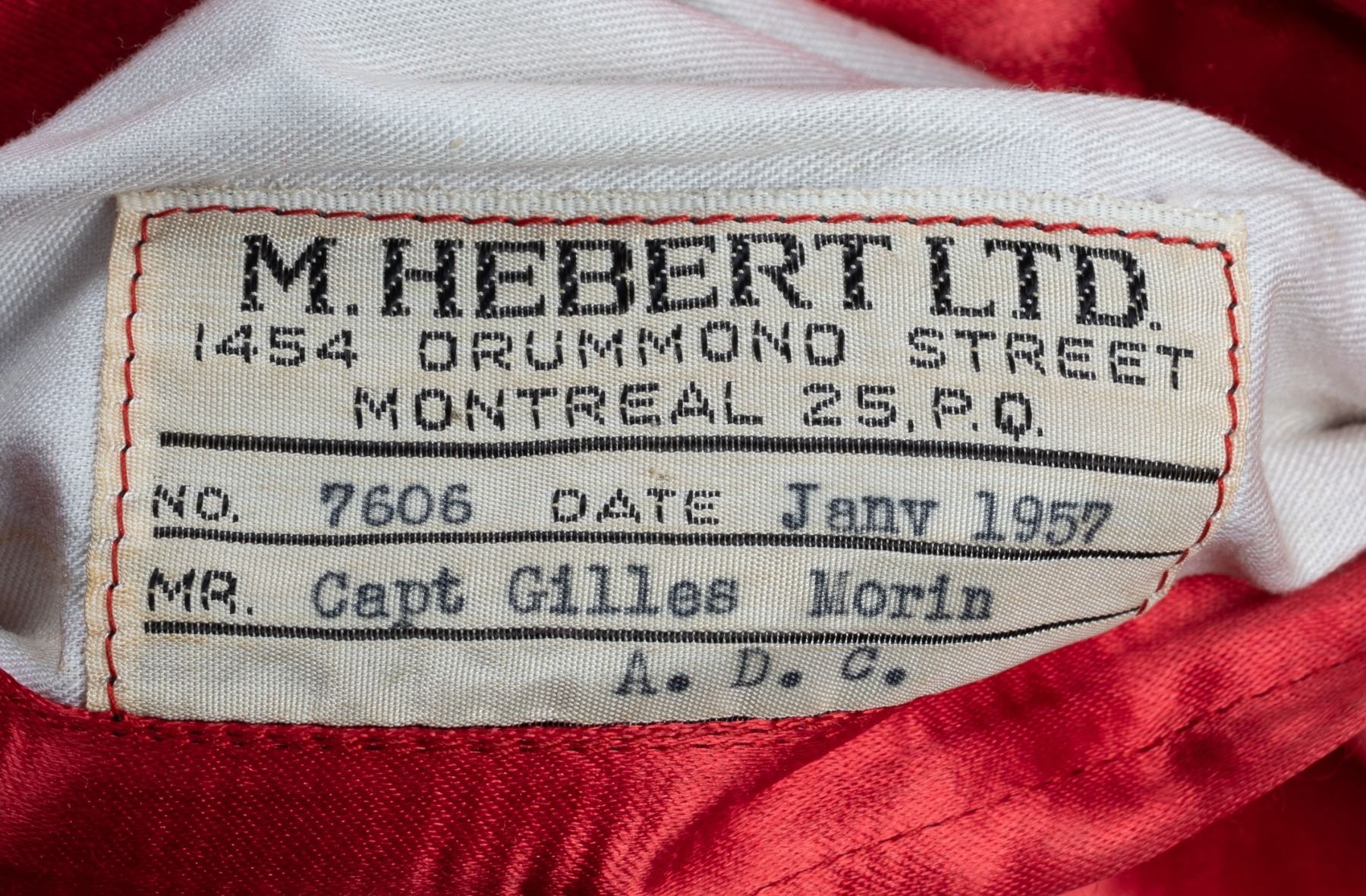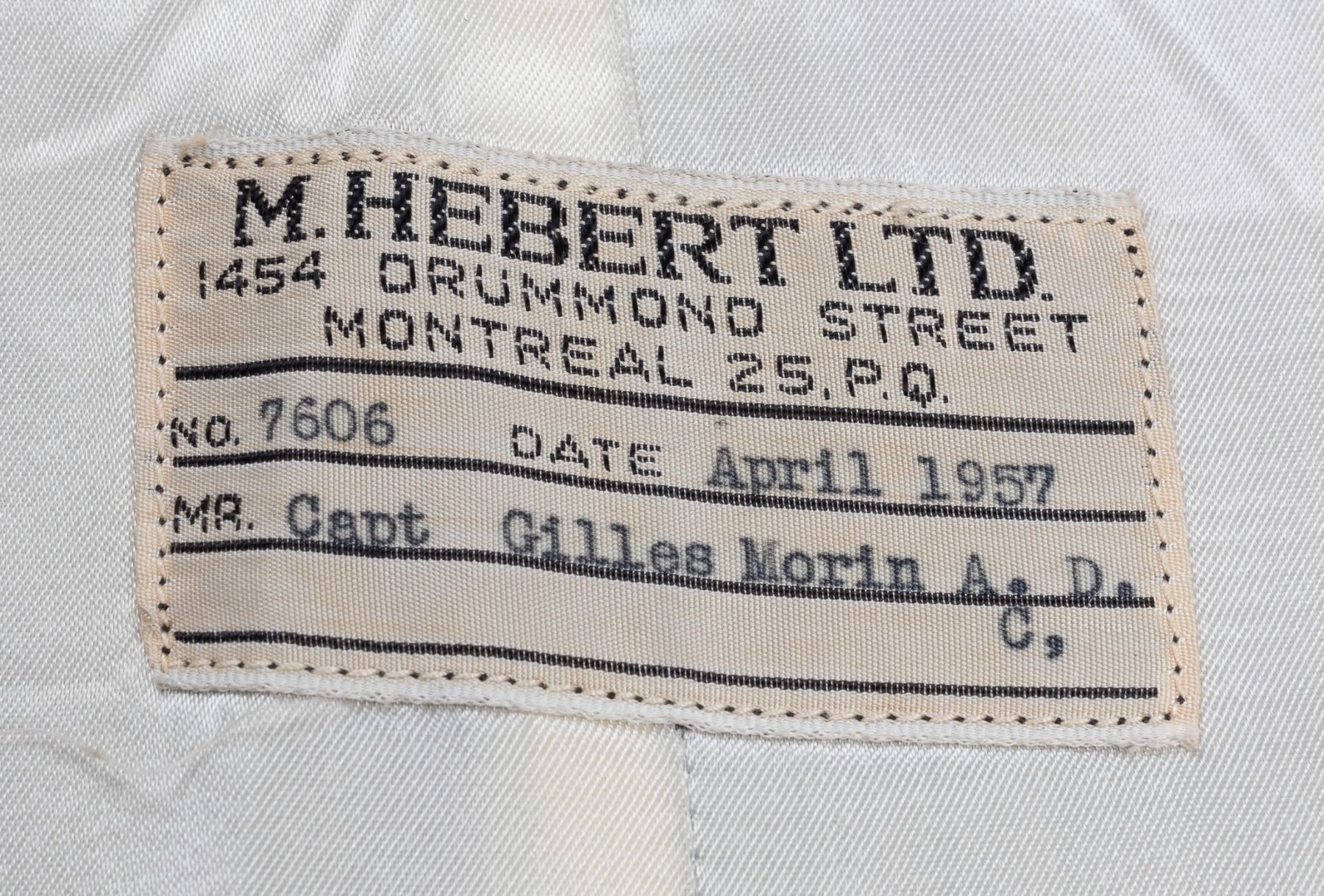 Dress uniform once belonging to Captain Gilles Morin, Aides-de-Camp, a member the Royal Canadian military. Lot includes a blue vest, a dress coat, and a pair of dress pants. Each piece is named to Captain Morin and dated from 1957. The vest is marked at the neck in blue crayon 'VE 2X'. The dress coat has three bullion wire stars on each shoulder.