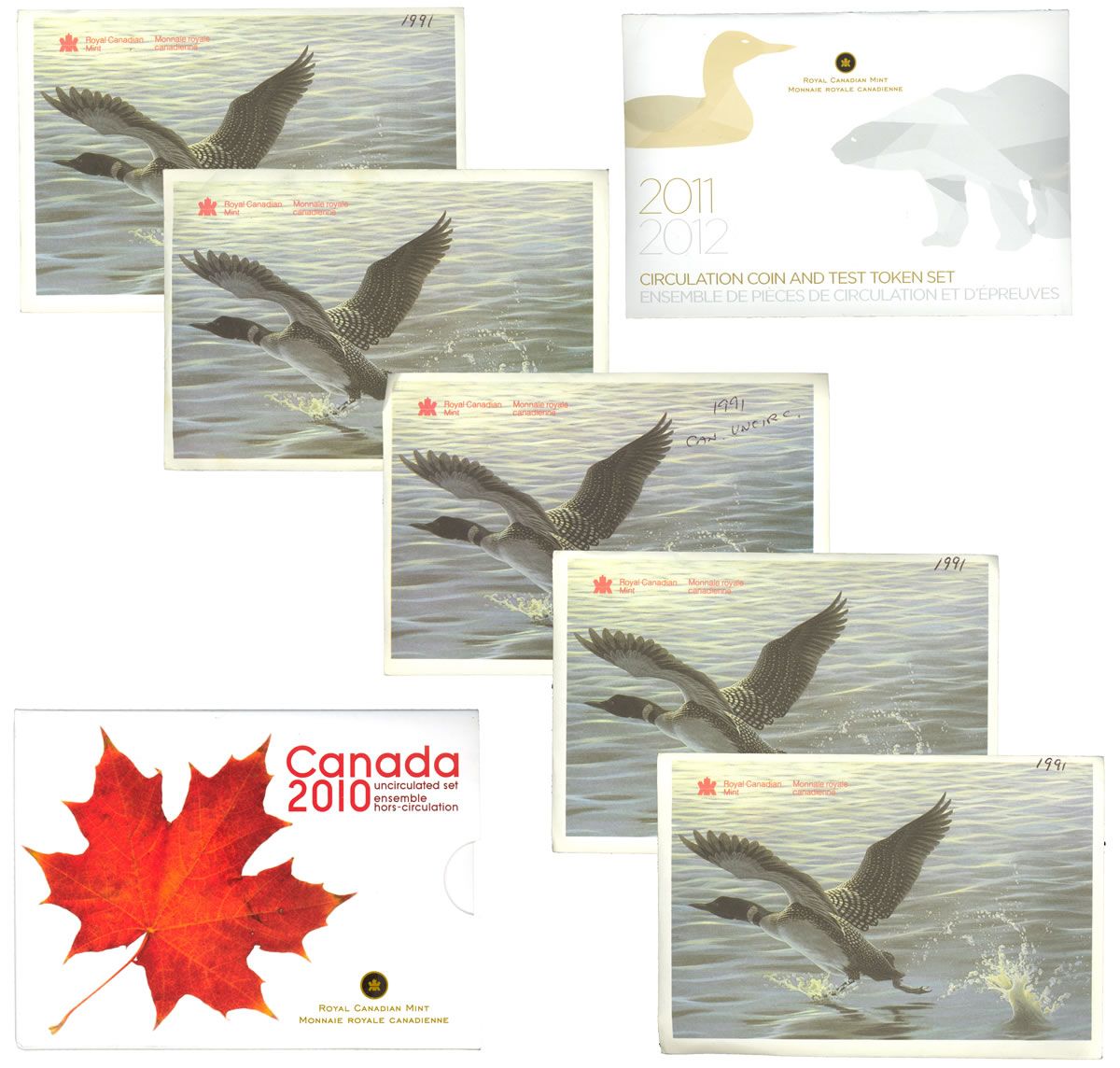 1). 1991 Uncirculated PL Set (5 sets). 2). 2010 Uncirculated PL Set. 3). 2011-2012 Circulation Coin and Test Token Set. Lot of Seven (7) pcs.