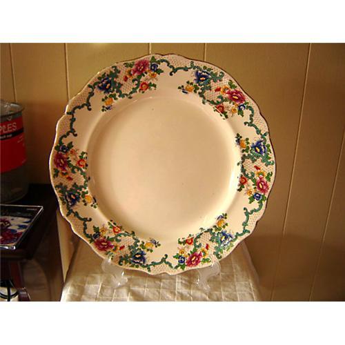 Rather large at 13" in diameter. The pattern is called Victoria. The edges are scalloped with a gold trim....some minor gold loss...age related.