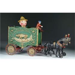ROYAL CIRCUS “FARMER’S VAN”. Highly desirable circus toy that when pulled along the floor, the rear wheels engage a geared mechanism causing the farmers head to pop out of the center of the van. Enameled in bright colors and trimmed in gold. The toy is complete and in original paint. An oddity is that this toy has two different wheels on the horses’ hoofs. This piece was on display at the Hubley offices in New York City. After the closure of the Hubley factory, the owner had it on display in his house in Lancaster, Pennsylvania. SIZE: 16”. CONDITION: Overall condition near mint, slight fading to paint on one side (sitting in sun?) Repair to a frame holding rear left wheel. One plume replaced. JL 1-4537 (4,500-6,000)