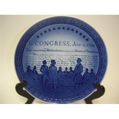 BICENTINNIAL PLATE NO. 2 IN 1975 ROYAL COPENHAGEN ISSURED THE FIRST IN A SERIES OF BICENTENNIAL PLATES. IT COMMEMORATED OUR OWN 200TH BIRTHDAY. ONLY A LIMITED NUMBER OF PLATES WERE MADE AND THE MOLDS THEN DESTROYED. THIS IS ONE OF THEM WHICH COMMEMORATED THE DECLARATION OF INDEPENDENCE OF THE UNITED STATES OF AMERICA ON THE JULY 4TH 1776. ON THE PLATE IT STATES UNITED STATES BICENTEMARY AE. IT COMES WITH ITS BOX.