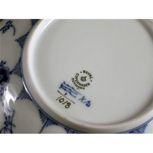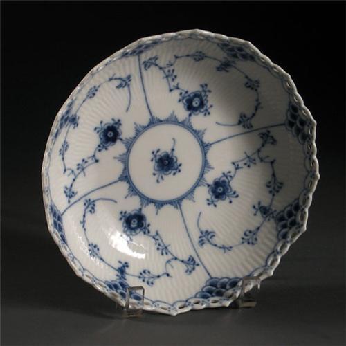 PORCELAIN: A porcelain Royal Copenhagen blue and white fluted porcelain dish, blue floral design, reticulated edge, hallmarked on underside with the initials ''XS'' and number 1/1018, 8 1/4'' diameter, no damage noted.