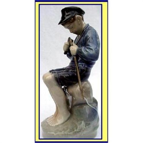 Royal Copenhagen figure of a boy carving a stick. Modelled by Chr. Thomsen in 1908.<BR>Measures 7 1/4inches high.<BR>Young boy in shorts, classic tones of blue clothes and hat, whittles away at a stick. A rope tied around his shoulder is hung with fishing utensils.<BR>Marked underneath with ROYAL COPENHAGEN DENMARK 905 mark.<BR>MINT condition. No damage of any sort.