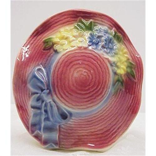 BEAUTIFUL AND COLORFUL FIGURAL VASE , DEPICTING, LOVELY HAT WITH FLOWERS AND RIBBONS, EXCELLENT CONDITION, NO CHIPS OR CRACKS BUT FOR A SUFACE CRAZING.