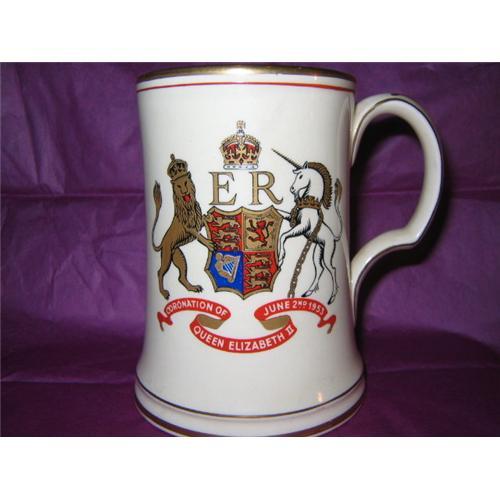 WONDERFUL MUG OF QUEEN ELIZABETH II FROM 1953 THE ROYAL CREST IS CLEAN NO SMEARS THE QUALITY OF THE GOLD LEAF IS STILL PERFECT.VERY NICE PIECE FOR THE COLLECTORS OF ROYAL PORCELIEN