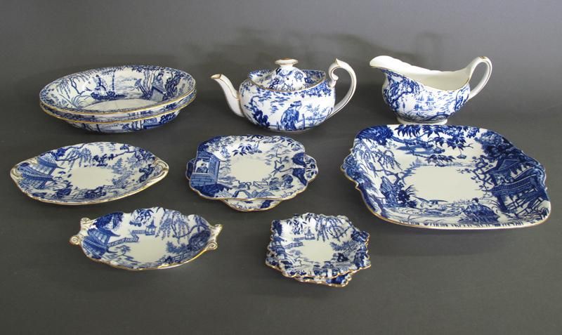 - 87 pieces of porcelain dinnerware comprised of: 12 dinner plates (10 in., 1927, 31, 32, 34,37, 38), 9 luncheon plates (9 in., 1926, 29, 30, 52), 10 salad/dessert plates (7 in., 1927, 31, 32, 33, 36, 38, 39), 12 bread & butter plates (6 in., 1926, 27, 28, 29, 30, 37, 38), 2 bread & butter plates (6 in., square, mark #5 in green, 1933), 12 teacups (1928, 29, 30, 31, 32, 37, 38, 54, 66, one cup slightly more squat, mark # 5 in green, 1925), 13 saucers (5.5 in., 1922, 23, 29, 31, 34, 37, 38), 2 saucers (5.75 in., 1954, 67), cream (mark #5 in blue/green, 1913), open sugar (mark #7 in red, 1966), teapot (16 fl. oz., 3.25 in. tall, mark #5 in blue/green, 1925), coffee pot (24 fl. oz., 6 in. tall, mark #5 in gry/black), oval platter (12 x 15 in., mark #5 in silver, 32 in red), open oval vegetable dishes (a. mark #5 in silver, 2 in red) (mark #7 in red, 1965), gravy boat (mark #5 in black, CK in red), gravy boat stand (mark #5 in black), salt & pepper (mark #5 in green, 1940), cake plate (9.25 x 10.5 in., mark #5 in blue, 1930), oval dish (4" x 6", mark #5 in dark green, 1938), 2 dishes (4.25 in. square, mark #5 in blue/black, 1931, P in red).