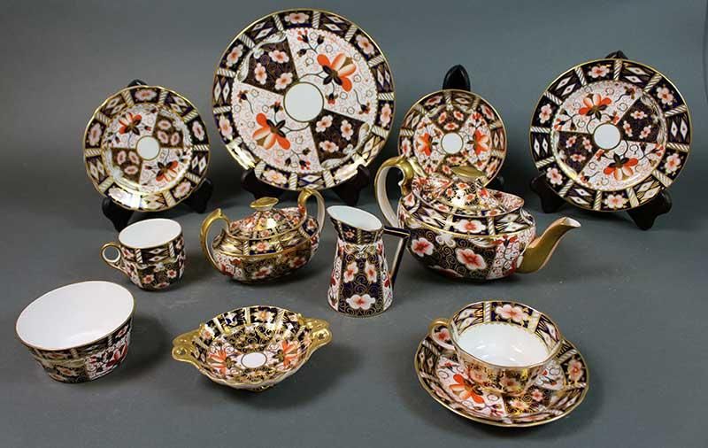 -approximately 33 pieces of Imari pattern porcelain teaware, #2451 pattern. Lot includes teapot, covered sugar, open sugar, creamer, 9 in. diameter plate, four 7.25 in. diameter plates, two 6.125 in. diameter plates, six saucers, four tea cups, six tea bowls, and others.