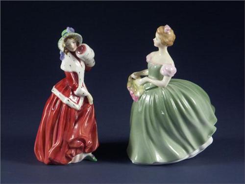 PORCELAIN: Two Royal Doulton porcelain figurines. The first is ''Clarissa'', HN 2345, 1967, green gown, pink sleeves, holding a flower basket, 7 3/4'' x 4'', hallmarked, no damaged noted. The second is ''Christmas Morn'', HN 1992, red dress, fur trim, green bonnet, 7 1/4'', hallmarked, not damage noted.