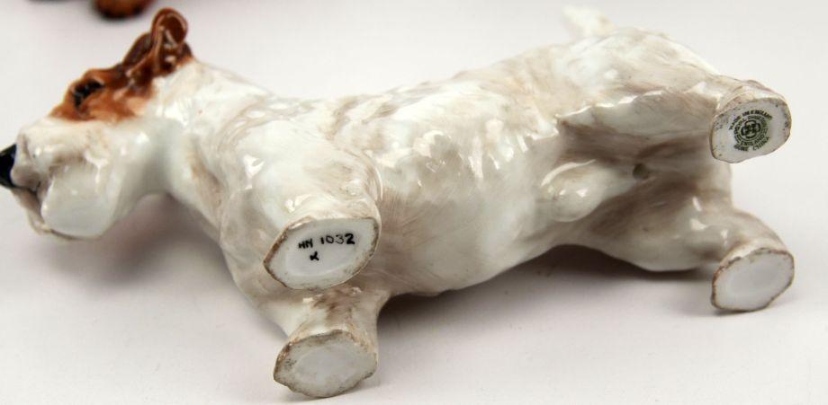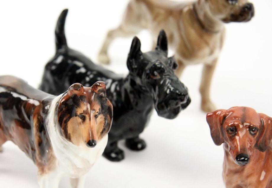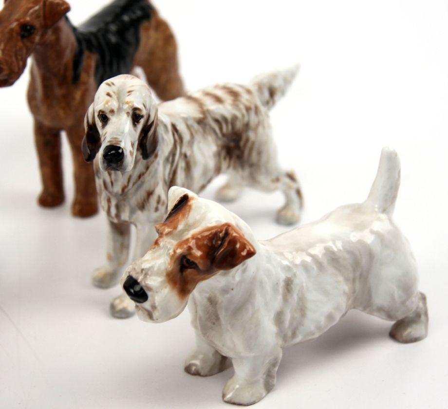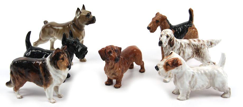 A collection of 6 hand painted Royal Doulton porcelain figurines and a 4.5 inch unmarked boxer figurine. Royal Doulton dogs include: 3 inch Dachshund HN 1141, 3 inch Sealyham HN 1032, 4 inch Airedale Terrier HN 1024, 3.5 inch Scottish Terrier HN 1016, 4 inch English Setter HN 2622, and a 3.5 inch Collie HN 1059.