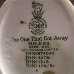 Royal Doulton figurine titled "The One that Got Away". Has broken left pinky. Marked on bottom with green Royal Doulton crest and H.N. 2153 and 4 Rd. No.s. 6.5" H.