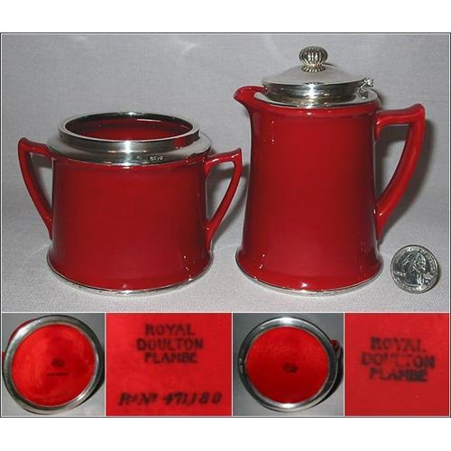 Royal Doulton Flambe Creamer and Open Sugar. Measures 4 3/4 inches tall and 3 inch tall. Applied Sterling lid, foot and rim caps. Each piece of Sterling has London hallmarks, a date code of circa 1910 and a silversmith's mark "G.S. & Sons"