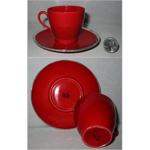 Royal Doulton Flambe demitasse cup and saucer. Cup measures 2 1/4 inches tall and 2 1/2 inch across. Saucer measures 4 1/2 inch across. Saucer has sterling rim cap. Sterling has London hallmarks, a date code of c. 1910 and a silversmith's mark "G.S. & Sons". Both cup and saucer are marked ROYAL DOULTON FLAMBE. Excellent condition - no chips, cracks nor repairs.