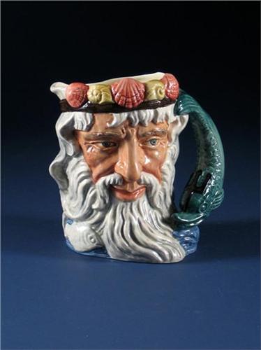 PORCELAIN: A Royal Doulton porcelain character jug, ''Neptune'', Roman god of the seas with a fish and trident handle, D6548, 1960, hallmarked lion on crown, large size, 7'' x 7'', no damage noted.