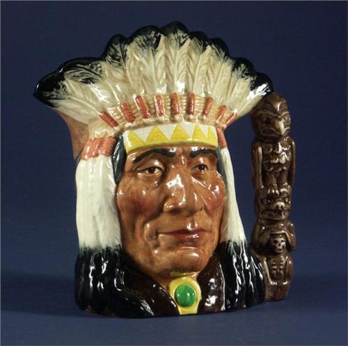 PORCELAIN: Two character jugs. A Royal Doulton porcelain character jug depicting the Chief of the Blackfoot tribe with a totem pole handle representing thunderbird and bear mother, ''North American Indian'', D6611, large, 8 1/4'' x 7'', 1966, hallmarked on underside, no damage noted. : A Royal Doulton Wild West Series porcelain character jug, ''Geronimo'', figural face with a peace pipe handle, D9733, 1984, medium, 6'' x 5 1/4'', no damage noted.