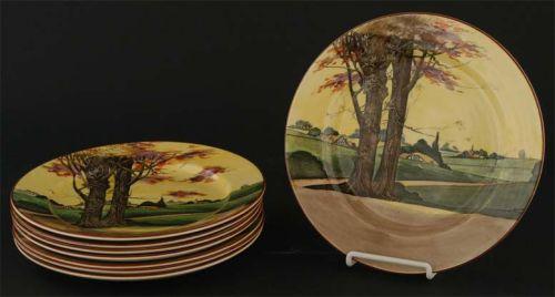 "ROYAL DOULTON PLATES set of 8 with hand painted scenic decoration, artist signed ""Sisne"", 10"" diameter, excellent, no chips or cracks packing and shipping (excluding insurance) $50"