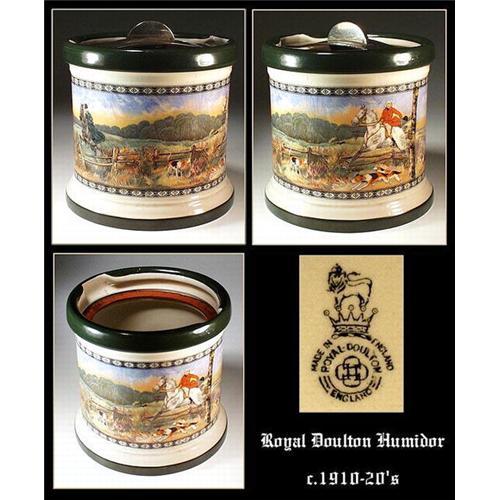 A hard to find Royal Doulton pottery humidor. The jar is decorated with hunting scene which wraps around perimeter and is over 15 inches long. Spring loaded wooden lid, base is marked with the Royal Doulton logo. Dimension : approx 5-1/4" tall and approx 5" in diameter. Except some crazing, this humidor is in excellent condition, no chips, cracks or repairs. It's a beauty!! For Ebay Live Auctions photo sizes are automatically reduced (and distorted), so if you want to see larger more detailed pictures, please email us.