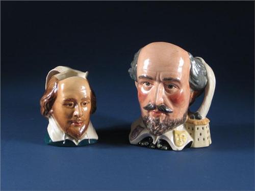 PORCELAIN: Two porcelain character jugs. The first is a Royal Doulton ''William Shakespeare'' character jug, figural face with a quill feather pen handle, D6689, large, 8'' x 6''. The second is a Staffordshire porcelain figural mug with a portrait face and a quill feather handle, 5 1/4''H x 4'', hallmarked. No damage noted to either piece