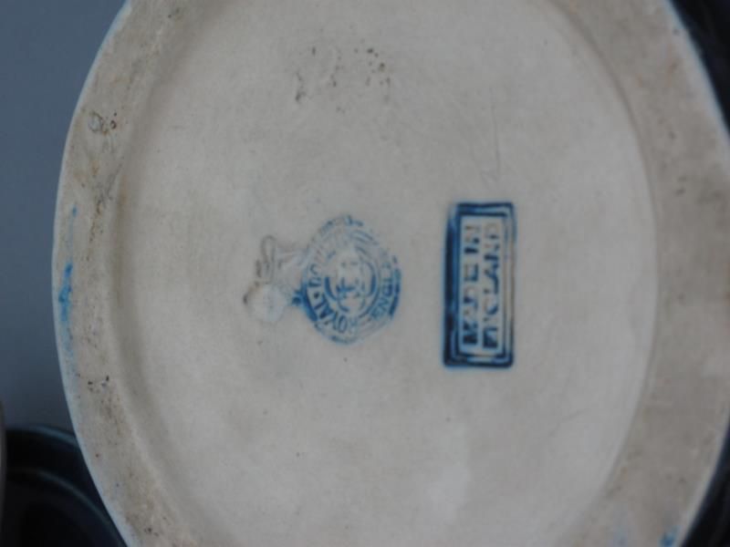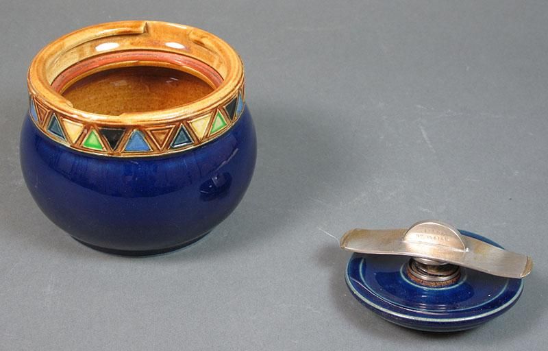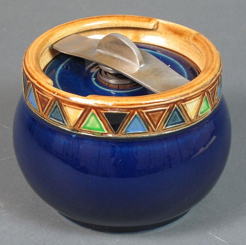 -with a rich cobalt blue glaze and colourful alternating geometric pattern band. Handle lock stamped Pat. No. 194168, incised marks to base.