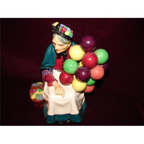 Made by Royal Doulton. This Darling Wonderful 8 1/4" in height little old lady sitting on a crate holding a bunch of beautiful gayly colored balloons. She is wearing a shawl and a floral hat. At her feet is a basket of balloons waiting to be inflated. H N 1315 in Excellent Condition. No chips, cracks or restoration. Very Collectible