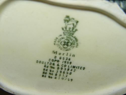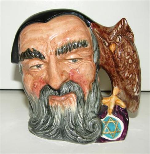 ROYAL DOULTON TOBY “MERLIN” CREAMER. Toby creamer has handle and is in the form of an older gentleman with owl perched on his shoulder. Marked on bottom “COPR. 1959” with 4 Rd. numbers. 3.5” H