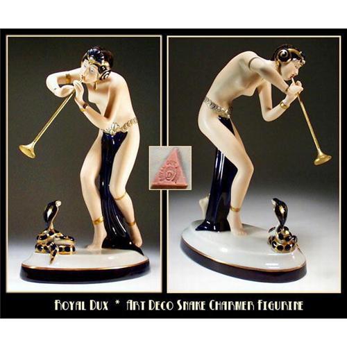 Breathtaking Art Deco figurine of a seminude female "SNAKE CHARMER". Hand painted in naturalistic colors in combination with cobalt blue and gold. Marked Royal Dux Bohemia in raised pink triangle on the base. MINT condition. Size : 9-1/4"H. For Ebay Live Auction, please Email for larger, more detailed photos. Please note that for Ebay Live Auctions only bids at or over $220.00 will be successful and meet our reserve.