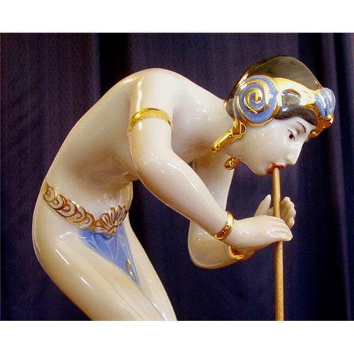 Breathtaking Art Deco female "SNAKE CHARMER" is one of the best designed - and sought after - Royal Dux figurines. This scarce decor version is underglaze hand painted in naturalistic colors, pale blue and gold. Marked Royal Dux Bohemia in raised pink triangle and incise stamped 702 (model #) on the base. MINT condition. Size : 9-1/4"H. More photos with frontal view available on request.