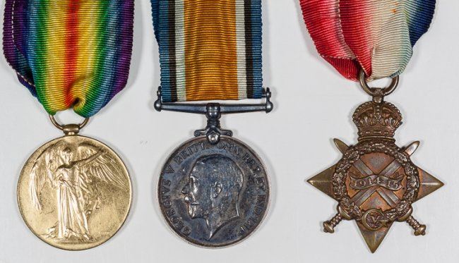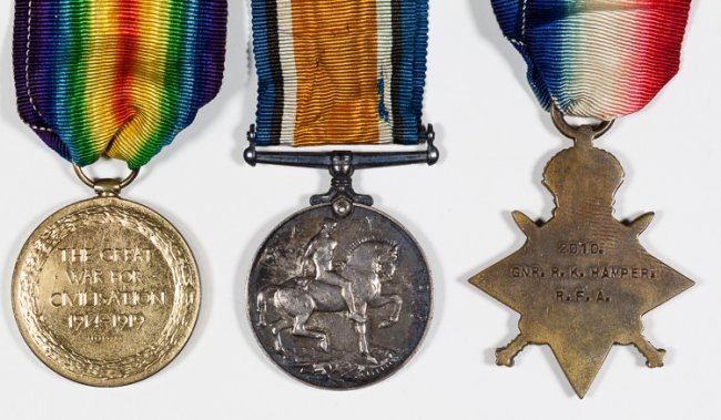 Lot of three medals named to British Gunner R. K. Hamper of the British Field Artillery includes the British Victory Medal, the 1914-15 Star, and the George V War Medal, the three affectionately called: "Pip, Squeak and Wilfred". With original ribbons.