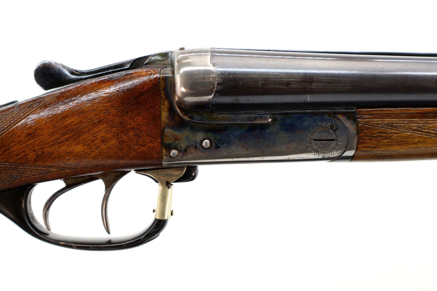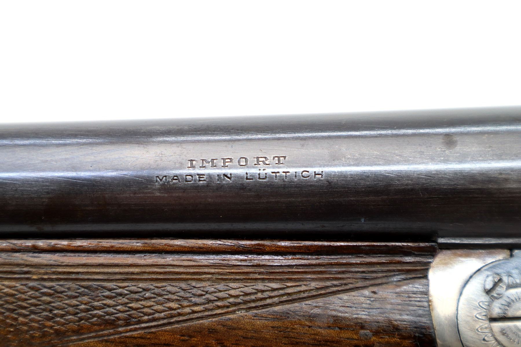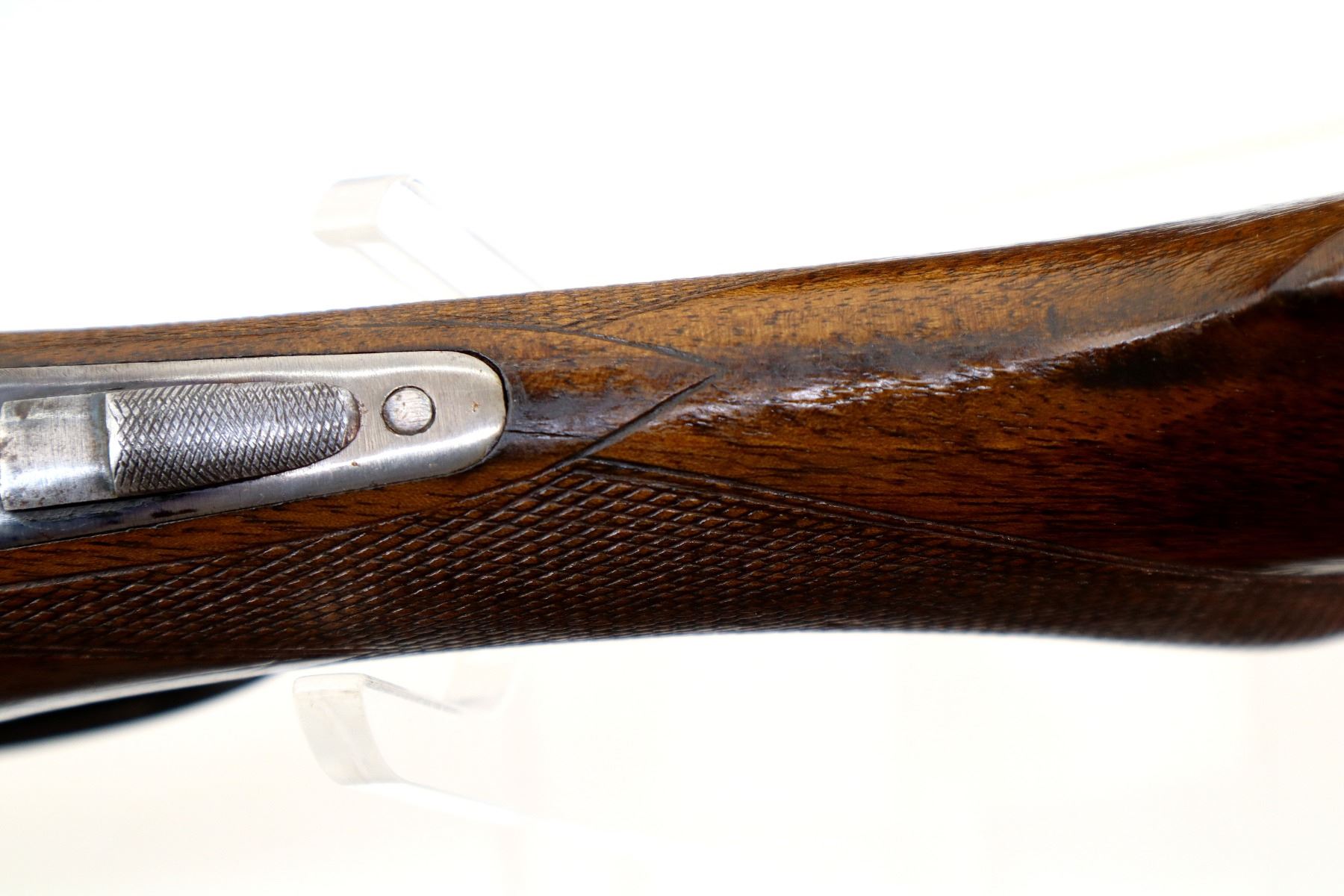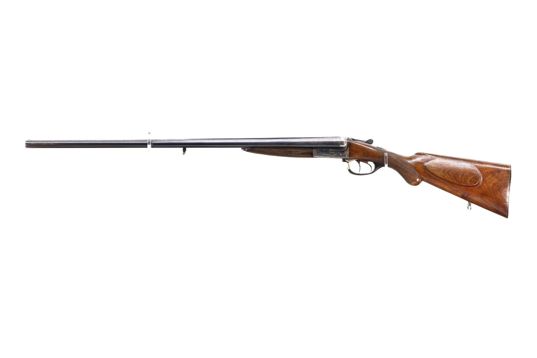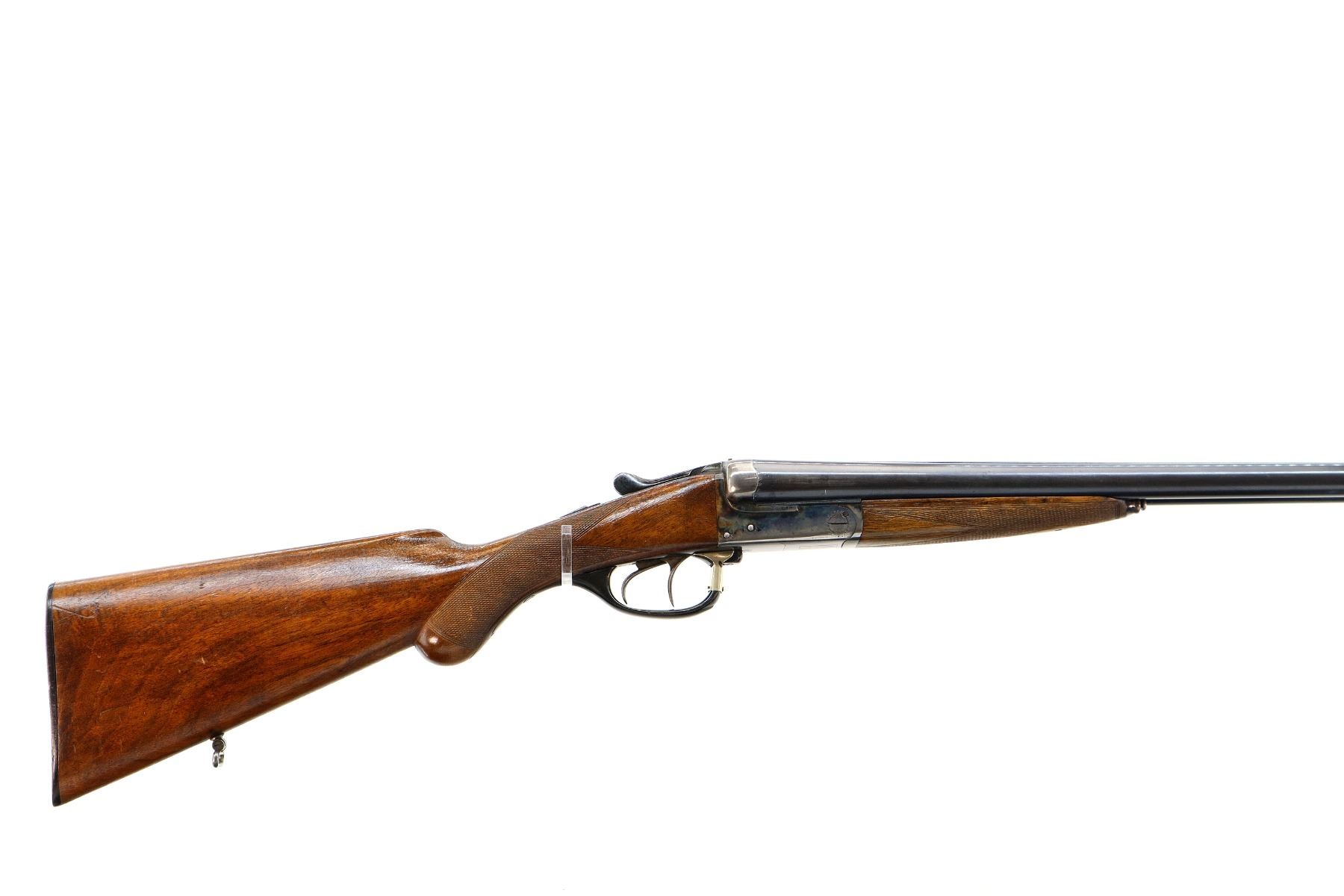 Main Description: Brass bead, blued barrels with solid rib, colour case hardened receiver, automatic safety, extractor, cocking indicators, double triggers. Horn trigger guard repaired at the front. Two piece wood stocks, checkered forearm and pistol grip, small crack behind upper tang, European cheek rest, grooved horn butt plate, sling swivels.