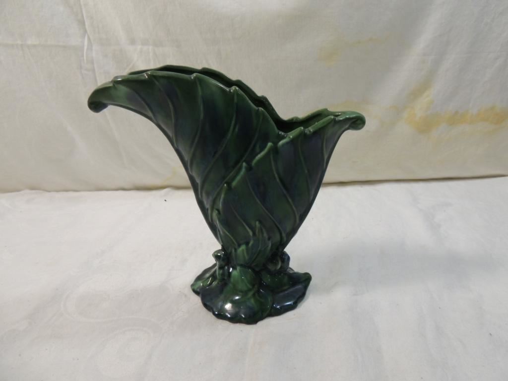 BLUE & GREEN ROYAL HAEGER VINTAGE POTTERY FAN LEAF VASE. DECORATIVE VASE, POTTERY VASE AS SHOWN SEE PHOTO FOR MORE DETAILS.