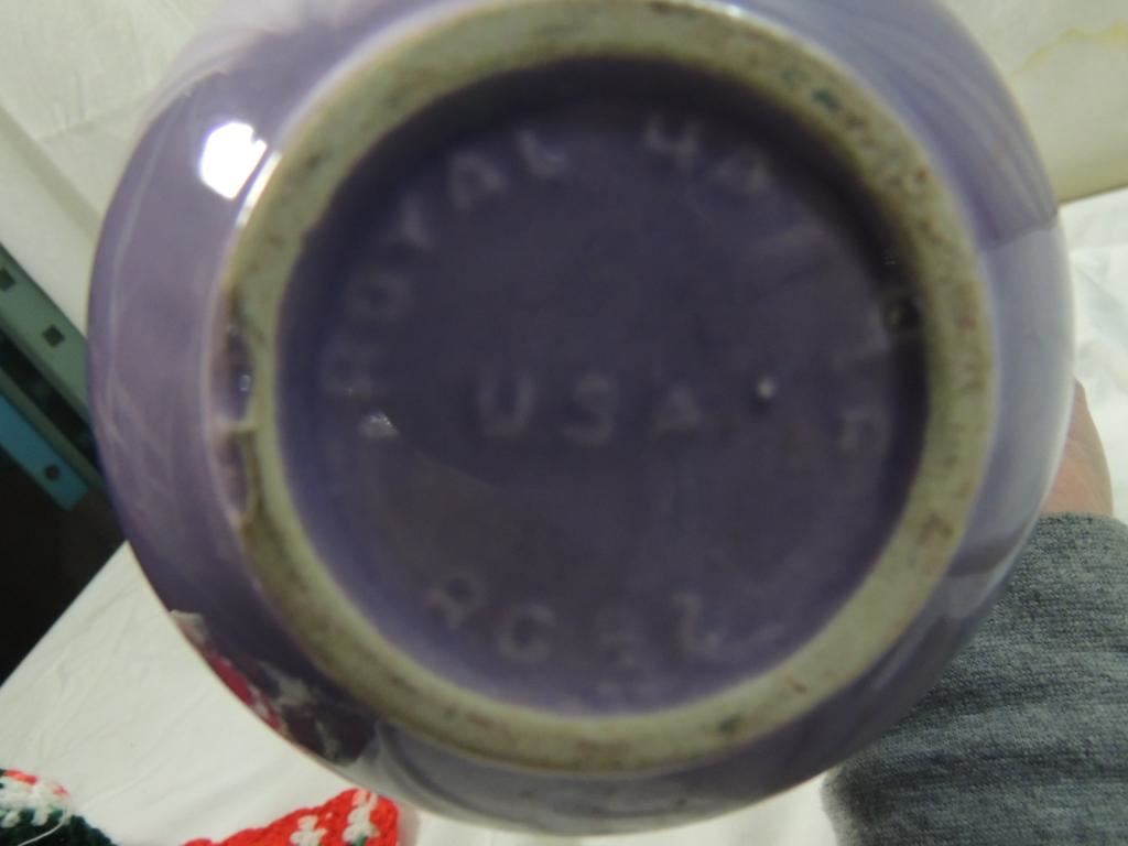 PURPLE AND BLUE ROYAL HAEGER POTTERY VASE, MID CENTURY CONTEMPORARY VASE PITCHER HANDLE VASE AS SHOWN SEE PHOTO FOR MORE DETAILS.