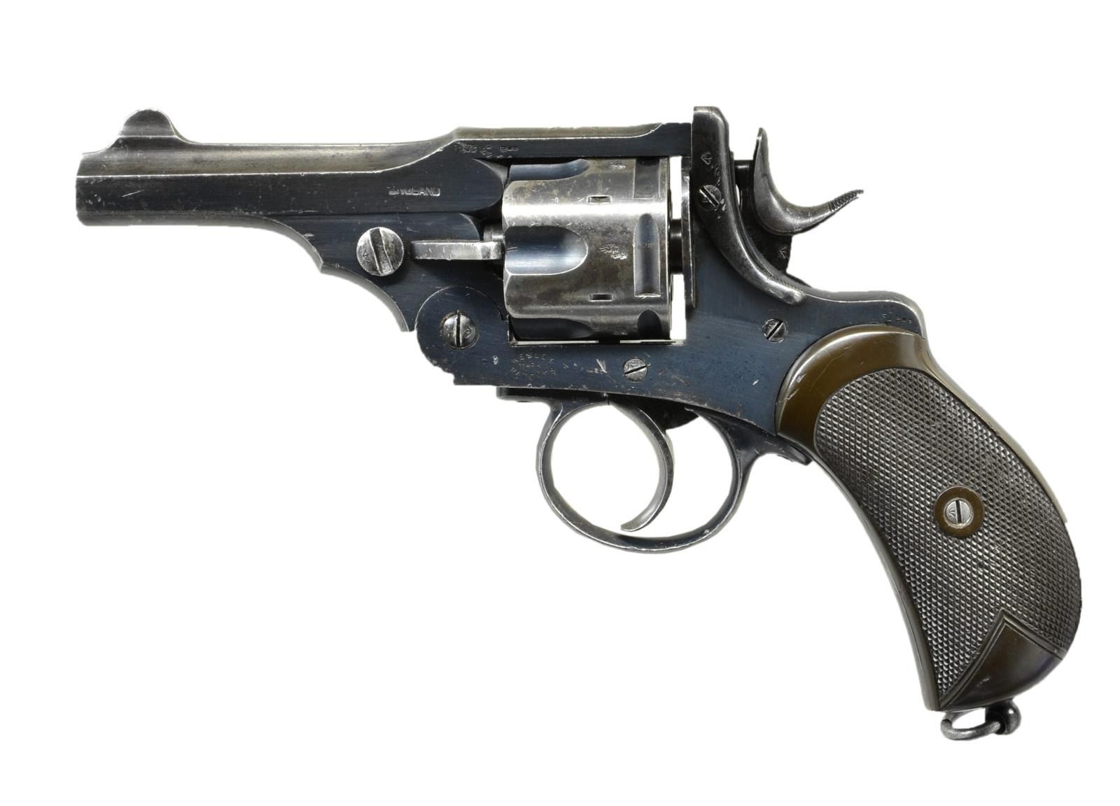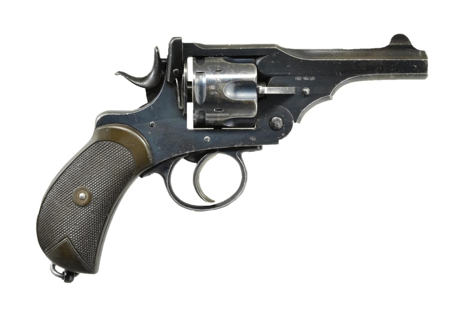 Cal. 455. S #29880. Bbl. 4”. Cyl. shaved to accept 45 Auto Rim. SA & DA. All visible S #s match. Frame marked on left side “WEBLEY MARK I PATENTS”. Marked on right side w/ Crown “V”. Bbl. marked on left side “ENGLAND” followed by broad arrow & “WD”. Top strap marked with large Royal Navy Broad arrow. Right side marked w/ asterisk & British nitro proof. Back strap marked “N” & “14”. Fixed sights. Birds head grip w/ checkered hard rubber panels. Lanyard ring present on butt. CONDITION: grips show moderate wear w/ scratches and flattened diamonds. Metal retains 60% arsenal rework blue w/ scattered thinning, wear, dents & scratches and a few spots of light pitting on cylinder. Most notable thinning on triggerguard, front of Bbl. front strap & back strap. Fair worn bore with a couple spots of light pitting. (01-21077/MJC). CURIO. $300-500