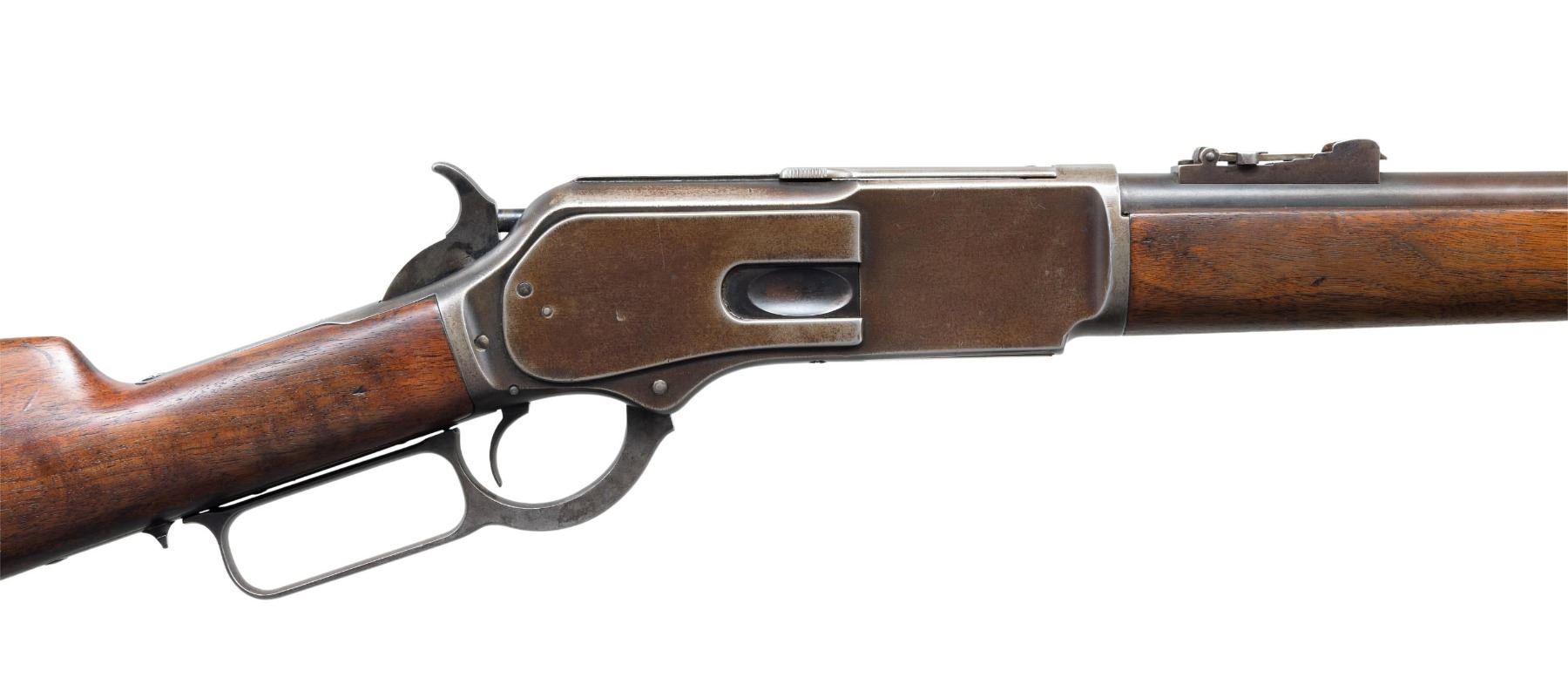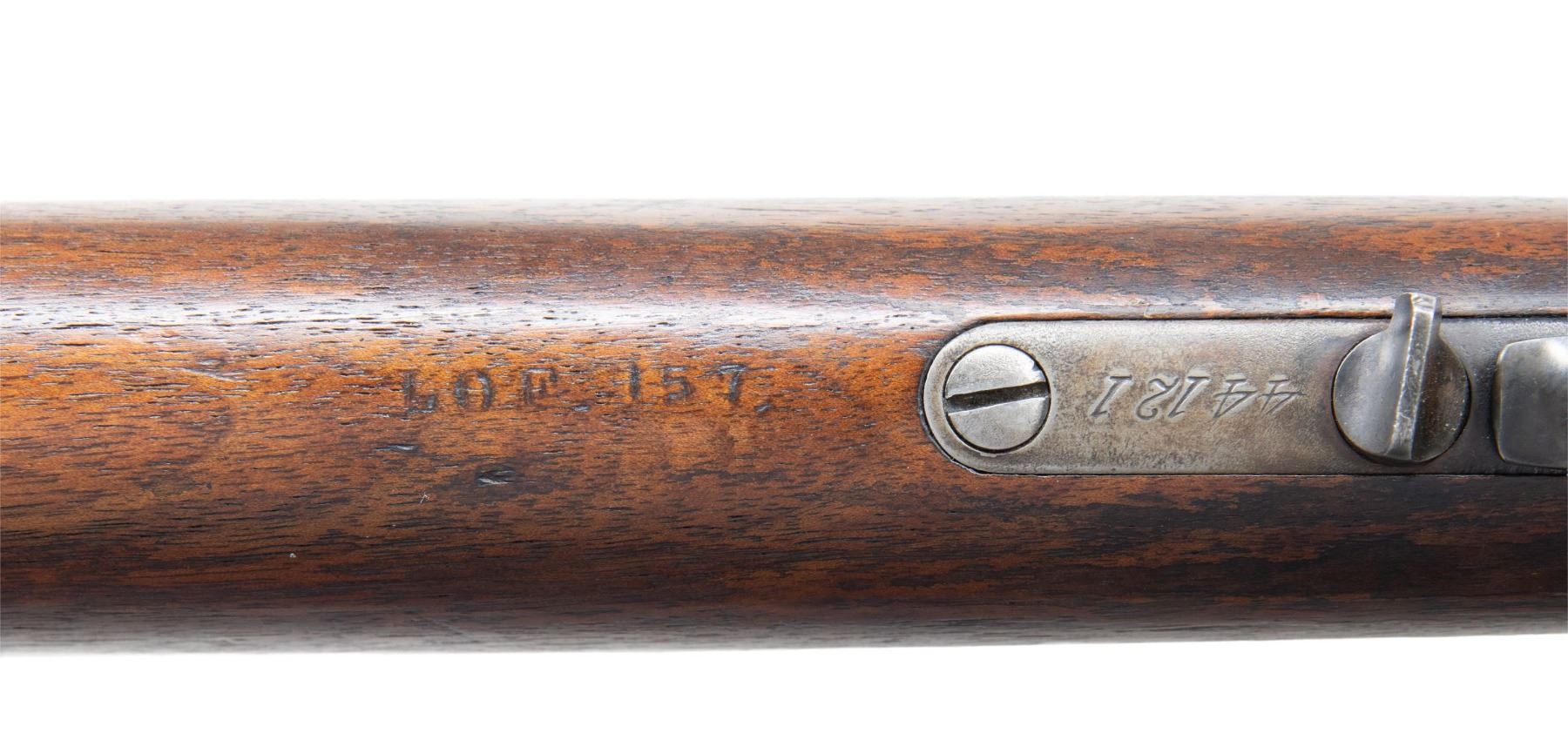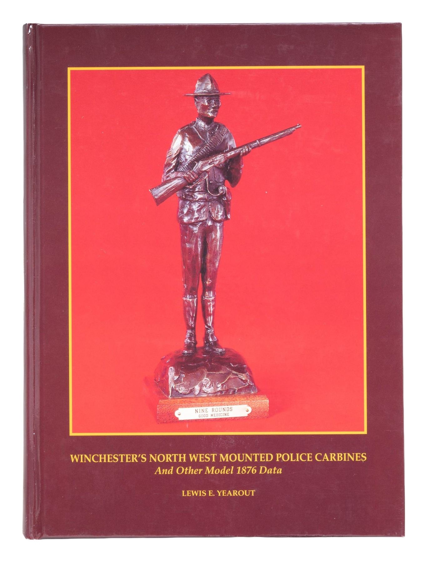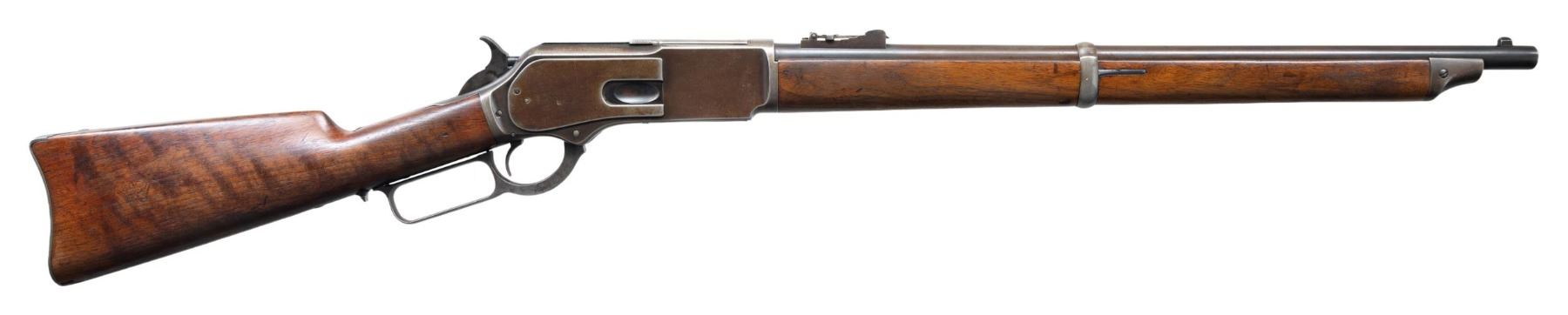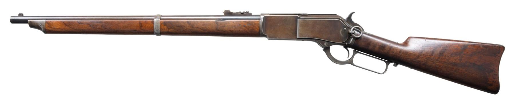 1876 LEVER ACTION SADDLE RING CARBINE. Cal. 45-75. S# 44121. Bbl. 22" rnd. with fixed front sight and proper graduated leaf rear sight. Tubular mag. Original finish was blue with case colored hammer and lever. Band fastened full length forearm and straight grip stock of nicely grained walnut with steel carbine buttplate. Left side of stock has banner marked "N.W.M.P." over identification # "40". Toeline of stock is stamped "LOF.157". 1,611 mfg. by Winchester for the NWMP between 1878-1885. Mfg. in 1884. UNATTACHED ACCESSORIES: the book "WINCHESTER'S NORTH WEST MOUNTED POLICE CARBINES" by Lewis E. Yearout. CONDITION: metal finish has faded to a light even brown patina showing small handling marks. Wood has worn finish with scratches and marks having a small chip left of action. Sound mechanics. Bore is generally bright with sound rifling. (01-27800/DS). ANTIQUE. $4,000-6,000.