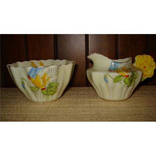 ON A CREAM COLORED GROUND ARE STREWN AN ASSORTMENT OF VIBRANT YELLOW AND BLUE POSIES ACCENTED WITH DEEP ORANGE AND BEAUTIFULLY DETAILED LEAVES AND STEMS, CULMINATING IN A DAZZLING DOUBLE FLOWER HANDLE ON THE CREAMER. TO ADD TO ITS CHARM, EACH PIECE IS SCALLOPED IN THE TYPICAL ART DECO FASHION. EACH SCALLOP HAS A RAISED "PIQUE" TEXTURED FROND. THE INTERIOR OF THE SUGAR BOWL IS ACCENTED WITH A LARGE STYLIZED YELLOW FLOWER OR DAFFODIL.<p>