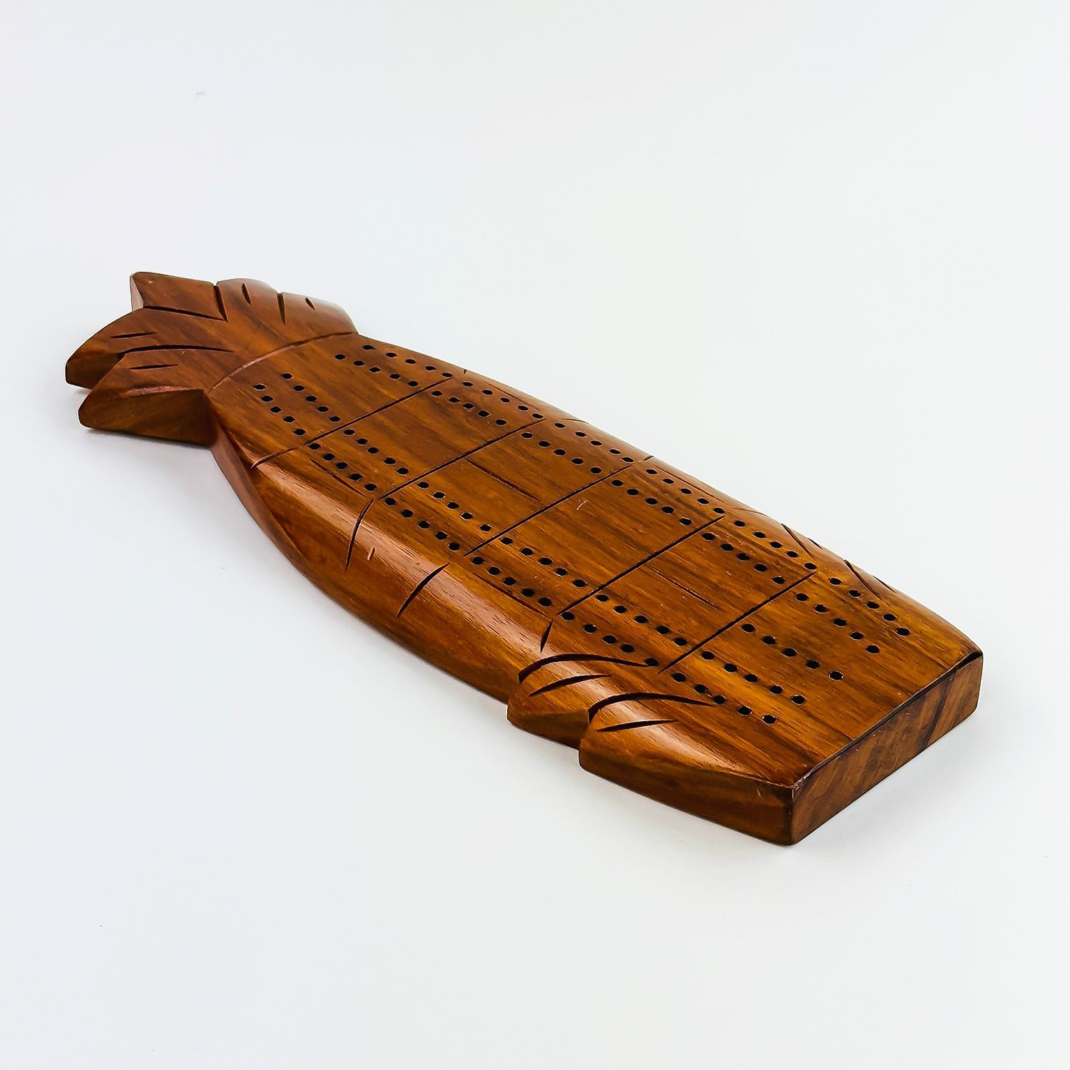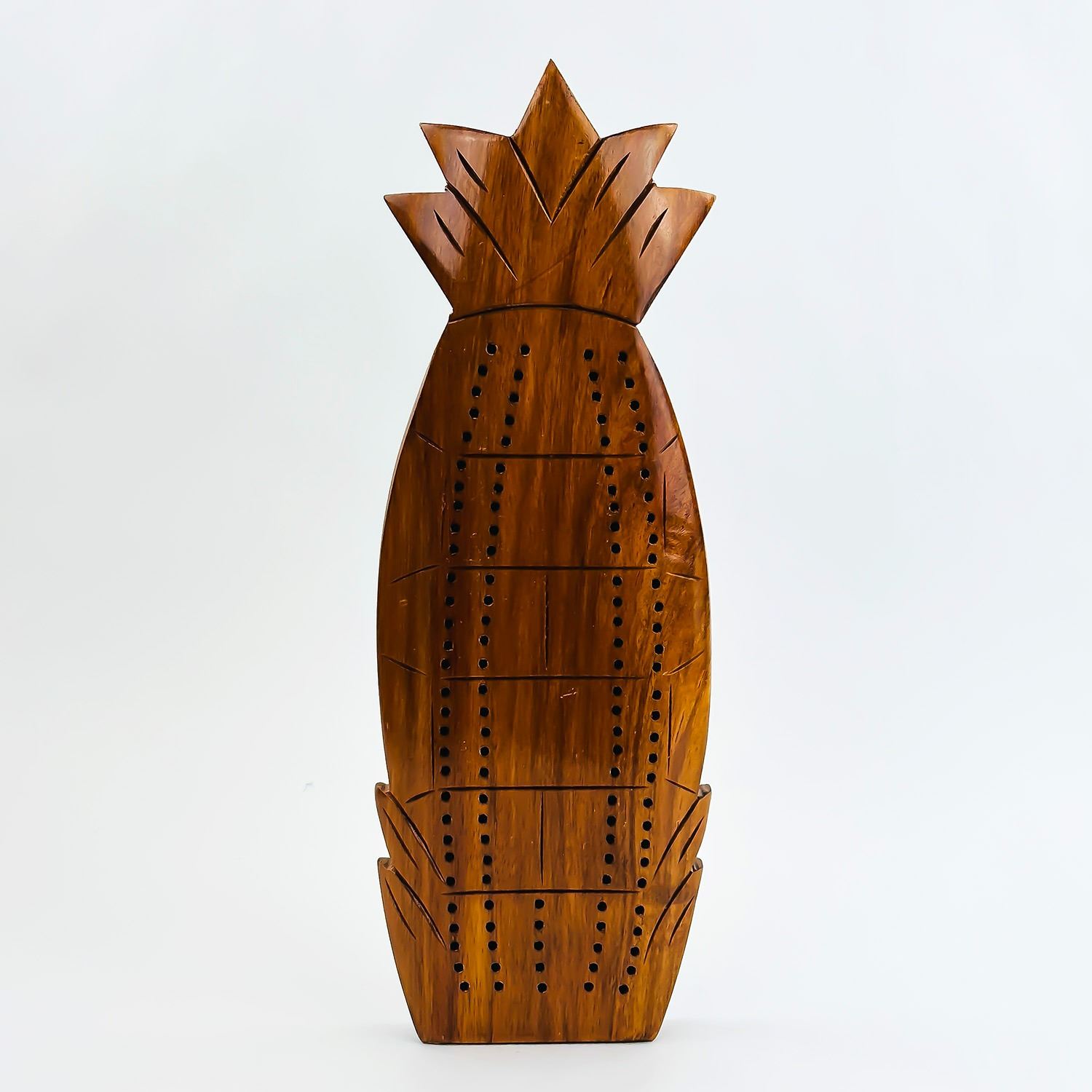 #8224 - VINTAGE - THE ROYAL PEDDLER - TROPICAL WOODS - KOA WOOD - MADE IN HAWAII. HAND CARVED PINEAPPLE SHAPED WOODEN CRIB BOARD GAME FROM HAWAII. MEASURES: 13” (33 CM) LONG BY 4.5” (11.5 CM) WIDE