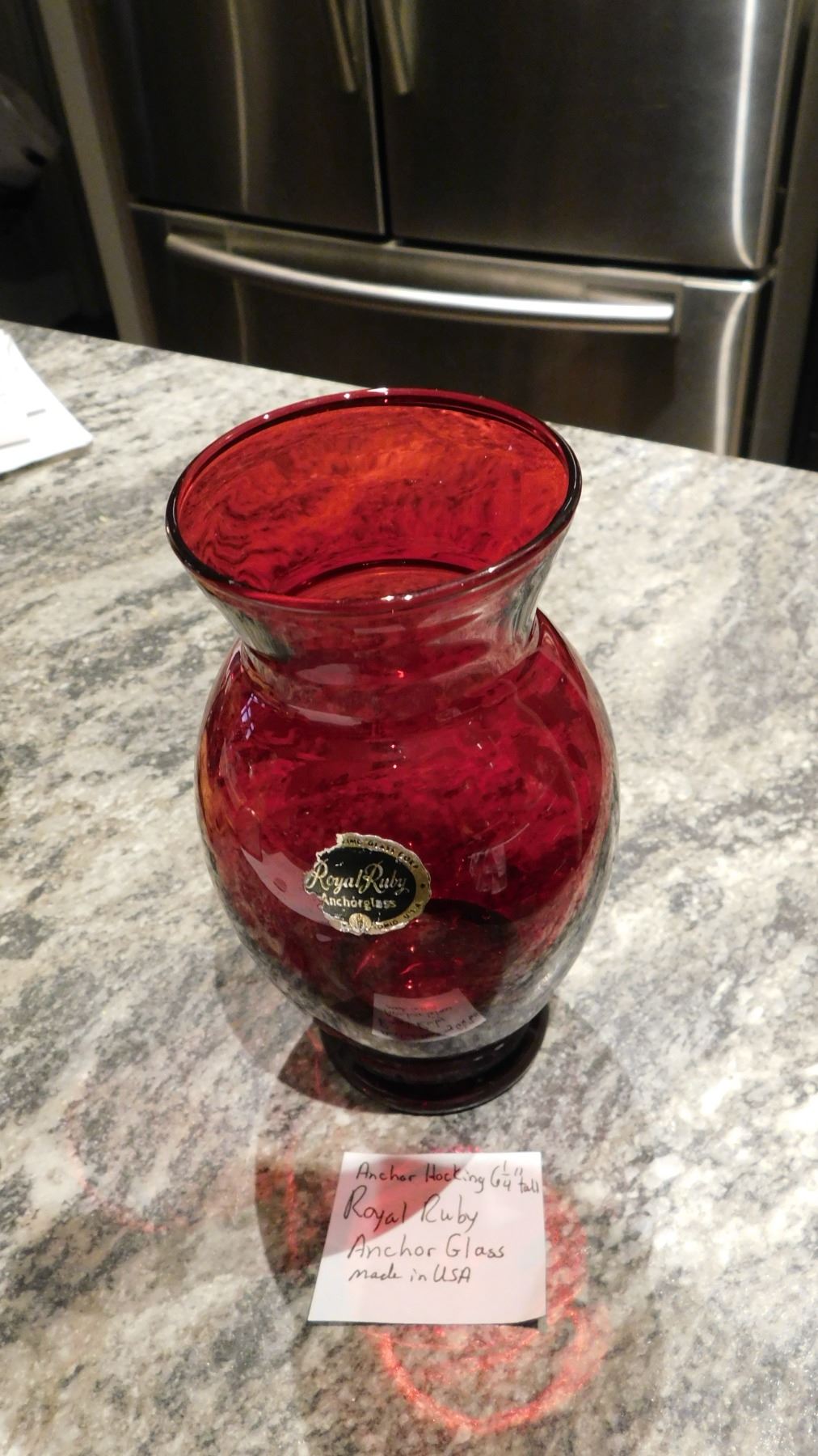 ROYAL RUBY, ANCHOR HOCKING, 6 ¼ “, FLOWER DESIGN, GLASS VASE, WITH LABEL